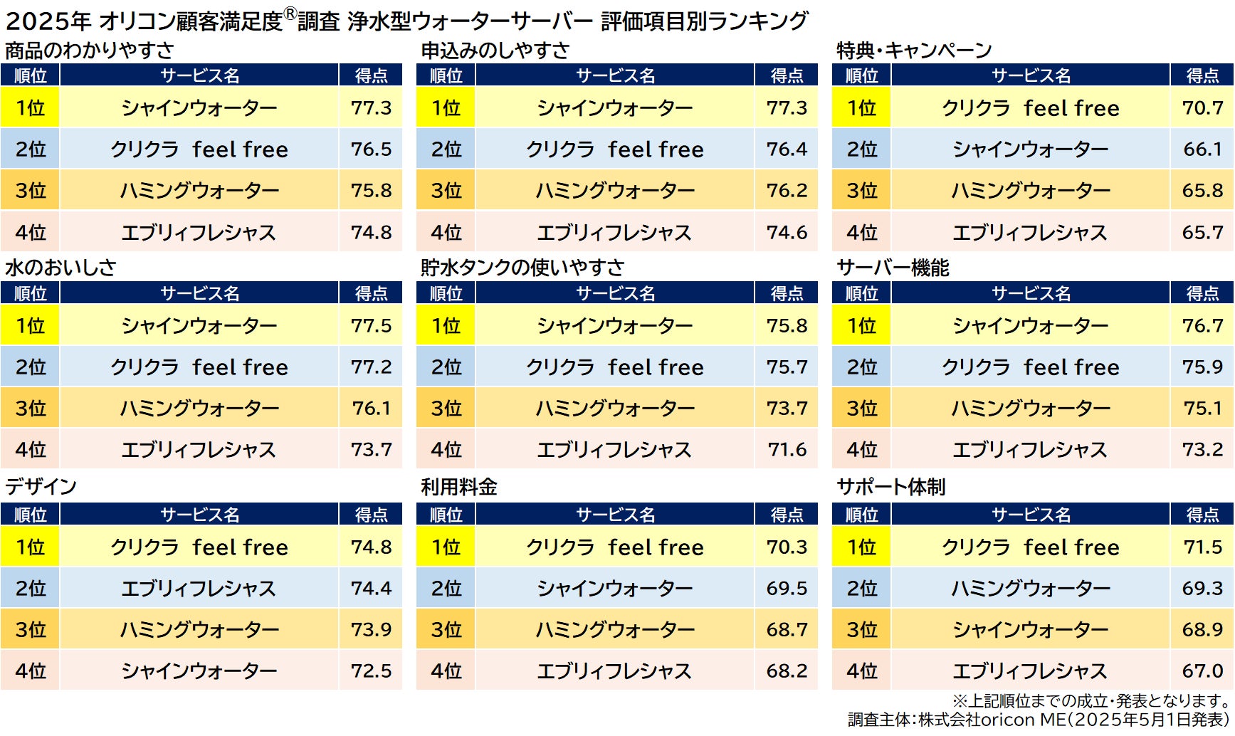 オリコン株式会社(本社:東京都港区 代表取締役社長:小池 恒、略称:オリコン)は、グループ会社である株式会社oricon MEが、実際のサービス利用者を対象に第三者の立場で実施した『ウォーターサーバー』『浄水型ウォーターサーバー』の顧客満足度調査の結果を、2025年5月1日(木)14時に「オリコン顧客満足度®」公式サイト内にて発表いたしました。ランキングの結果は下記の通りとなりました。