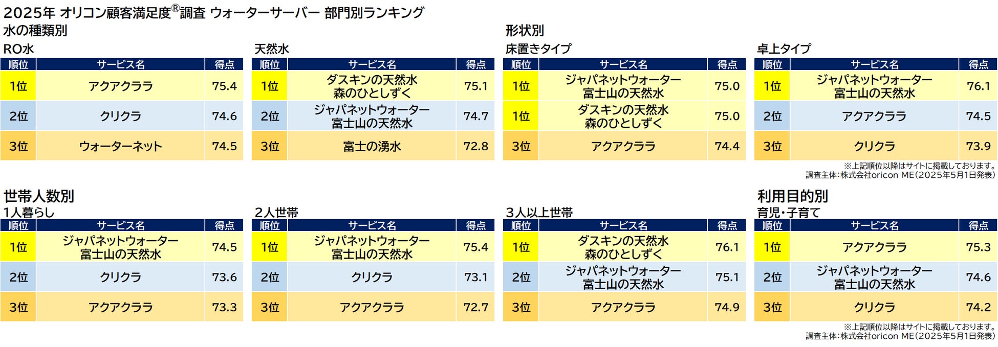 「水のおいしさ」「ボトル交換のしやすさ」「サーバー機能」「デザイン」「利用料金」「宅配システム」「サポート体制」 ■部門別 水の種類別「RO水」「天然水」/形状別「床置きタイプ」「卓上タイプ」/世帯人数別「1人暮らし」「2人世帯」「3人以上世帯」/利用目的別「育児・子育て」