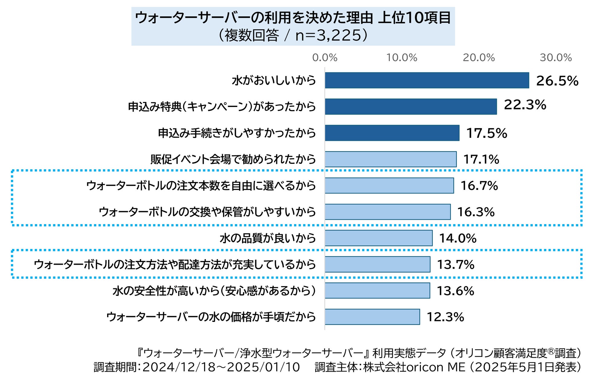 今回、直近の調査対象者(『ウォーターサーバー』利用者:3,225人、『浄水型ウォーターサーバー』利用者:1,193人 調査期間:2024/12/18~2025/01/10)に、「サービスの利用を決めた理由(複数回答)」について聴取しました。