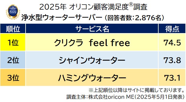 『浄水型ウォーターサーバー』は【クリクラ feel free】が3年連続の総合1位(オリコン顧客満足度®調査)