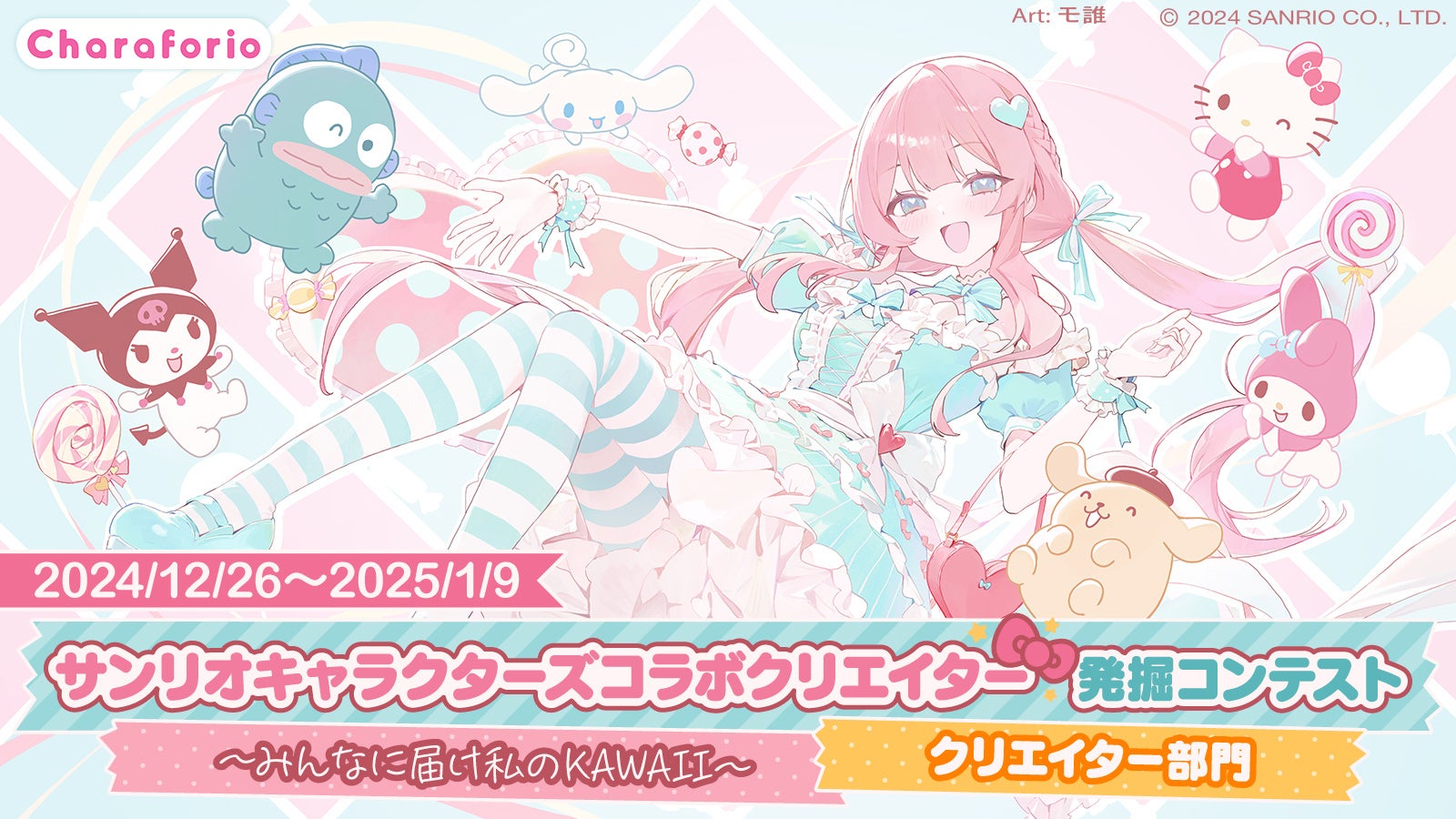 株式会社サンリオ(本社:東京都品川区 代表取締役社長:辻󠄀 朋邦、以下サンリオ)は、クリエイター支援のための新規事業として運営している、公式(IPホルダー)とファンがつながる創作プラットフォーム「Charaforio(キャラフォリオ)」内のイベントとして「サンリオキャラクターズコラボクリエイター発掘コンテスト」を12月26日(木)から開催いたします。本コンテストでは、「KAWAII」をテーマとしたオリジナルイラストを投稿しエントリーしたクリエイターの中から、最優秀賞と優秀賞を選出します。選出されたクリエイターには、特典として、サンリオキャラクターとのコラボイラストによる商品化の機会等を提供いたします。