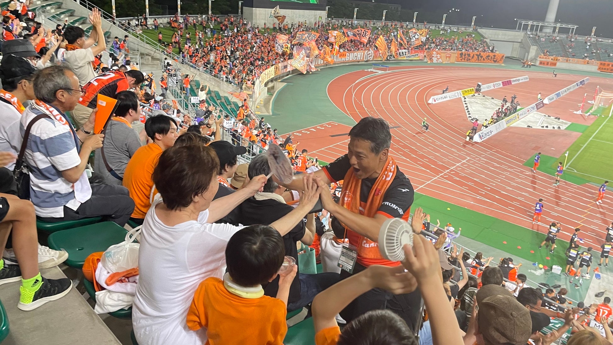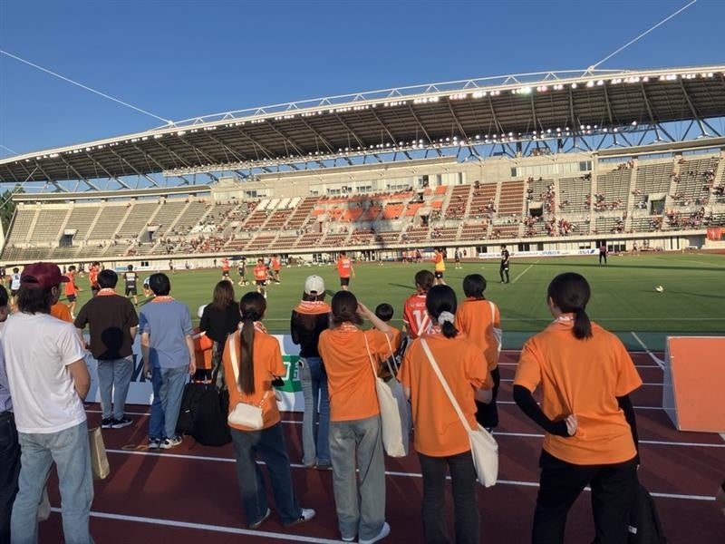 また、今年もレノファ山口FCさんのご厚意により、社員やご家族のみなさんがピッチに降りて試合直前の選手のウォーミングアップの様子を間近に見学することができ、みなさんの応援にもより熱が入りました。また、ゴールの際はハイタッチでおおいに盛り上がりました。レノファ山口FCのみなさんの最後まで勝利を追求した姿に力をもらいました。熱い試合をありがとうございました!カンロはこれからもレノファ山口FCさんと一緒に地域を盛り上げていきたいと思います。