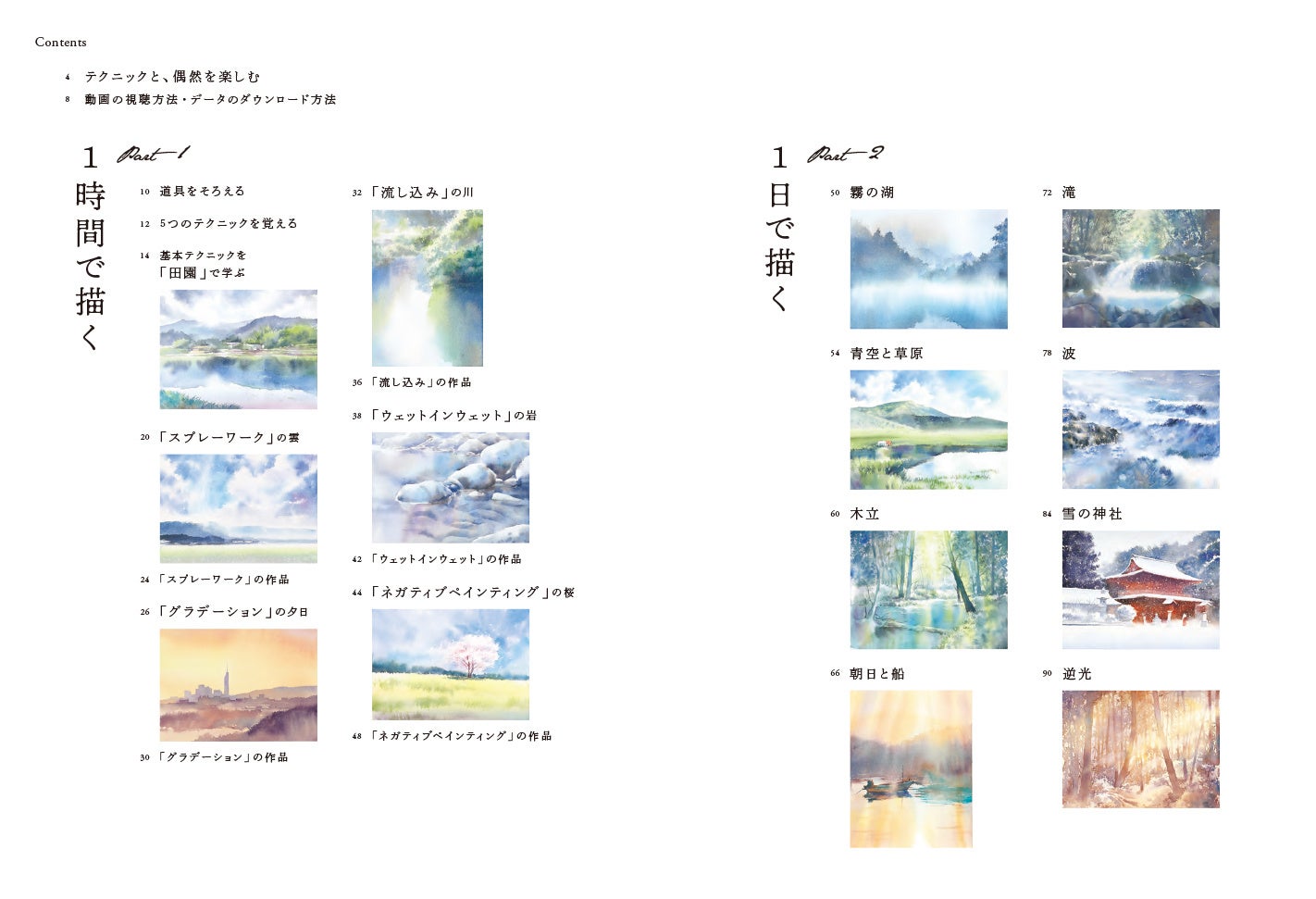 本書では夜景、雪景色、山の風景、桜、波濤の海、光の差し込む空……さらには難しい寺社仏閣や、船などの建造物も春﨑さんのテクニックで、1日を目標に描くことができます。