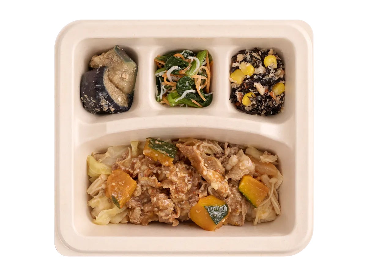 おいしさを感じていただけるよう、メインの牛肉には本醸造醤油のもみだれを絡め、さらにコクと風味のある特製焼肉のたれをかけています。キャベツ、えのき、かぼちゃと一緒にお召し上がりください。