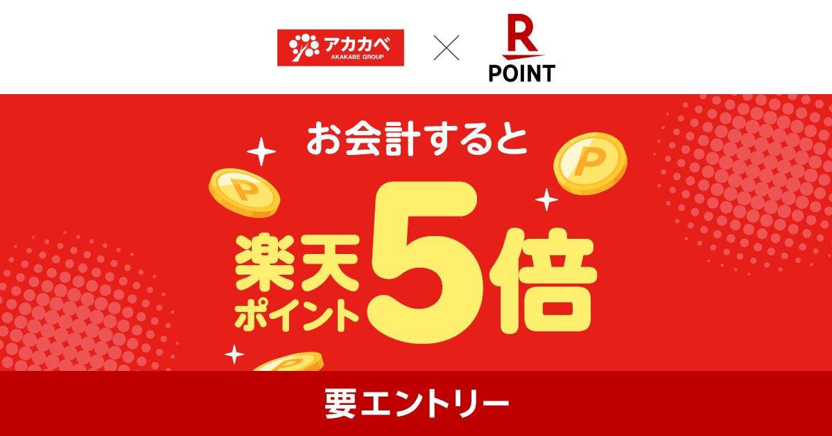 本導入を記念して、2025年5月20日(火)から2025年6月19日(木)まで、「アカカベ 楽天ポイントカードサービス開始記念!楽天ポイント5倍キャンペーン!」を実施します。本キャンペーンでは、キャンペーン期間中にエントリーのうえ、対象店舗で「楽天ポイントカード」(注2)を提示して200円(税抜)以上支払いをした方に、「楽天ポイント」を通常の5倍進呈します。