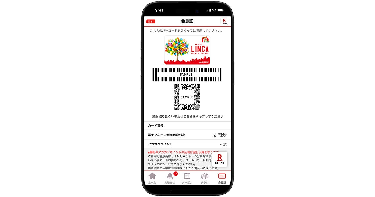 また、本サービス開始に伴い、「アカカベ公式アプリ」で「楽天ポイントカード」のバーコードが提示できるようになります。さらに、利用者は、店舗での会計時に「アカカベポイントカード LINCA」と「楽天ポイントカード」(注2)を同時に提示することで、「アカカベポイント」と「楽天ポイント」をダブルでお得に貯めることができます。