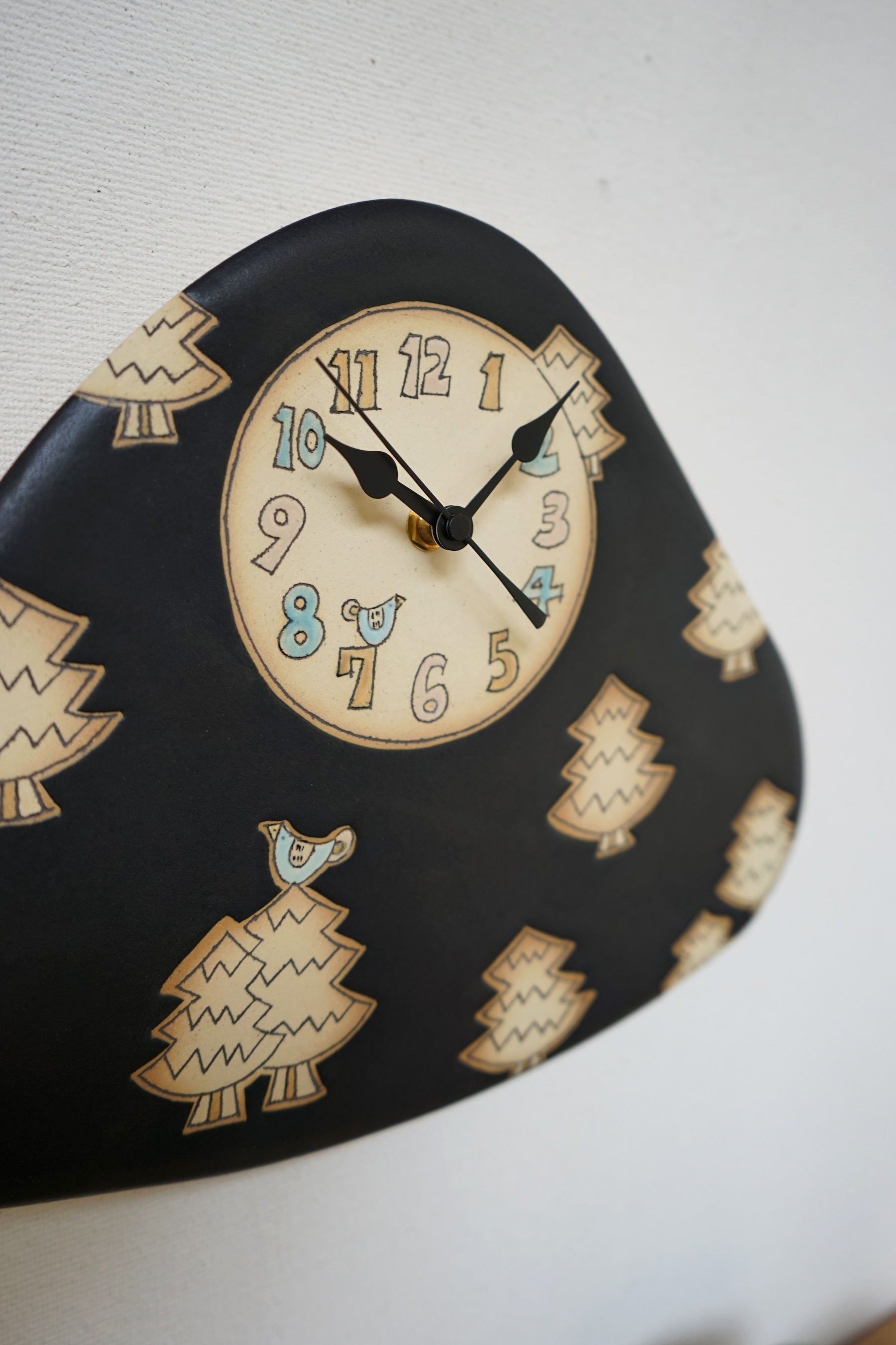 本展では、メインの作品でもある壁掛け時計を中心に、カップや器、オブジェ、アクセサリーなど、数多くの作品が並びます。それらの作品は、筆で柄を描くのではなく、液状にした粘土(化粧土)を彫った模様に入れていく「象嵌(ゾウガン)」という技法が用いられており、模様には立体的な奥行きが生まれます。