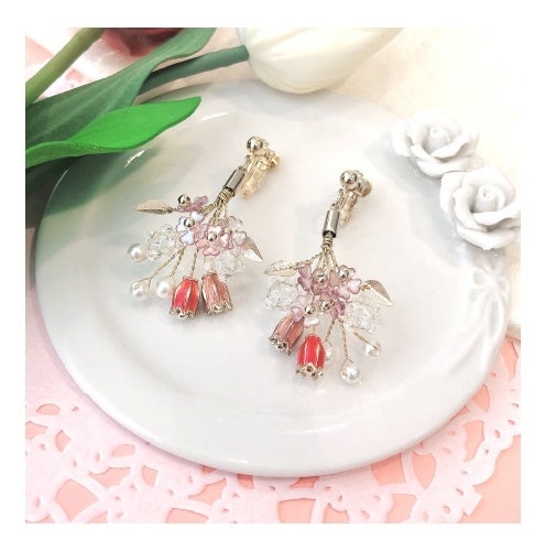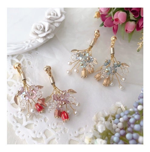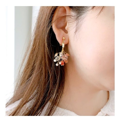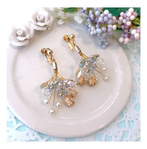 くすみカラーで優しい雰囲気のフラワーブーケのイヤリングをお作りいただけます。