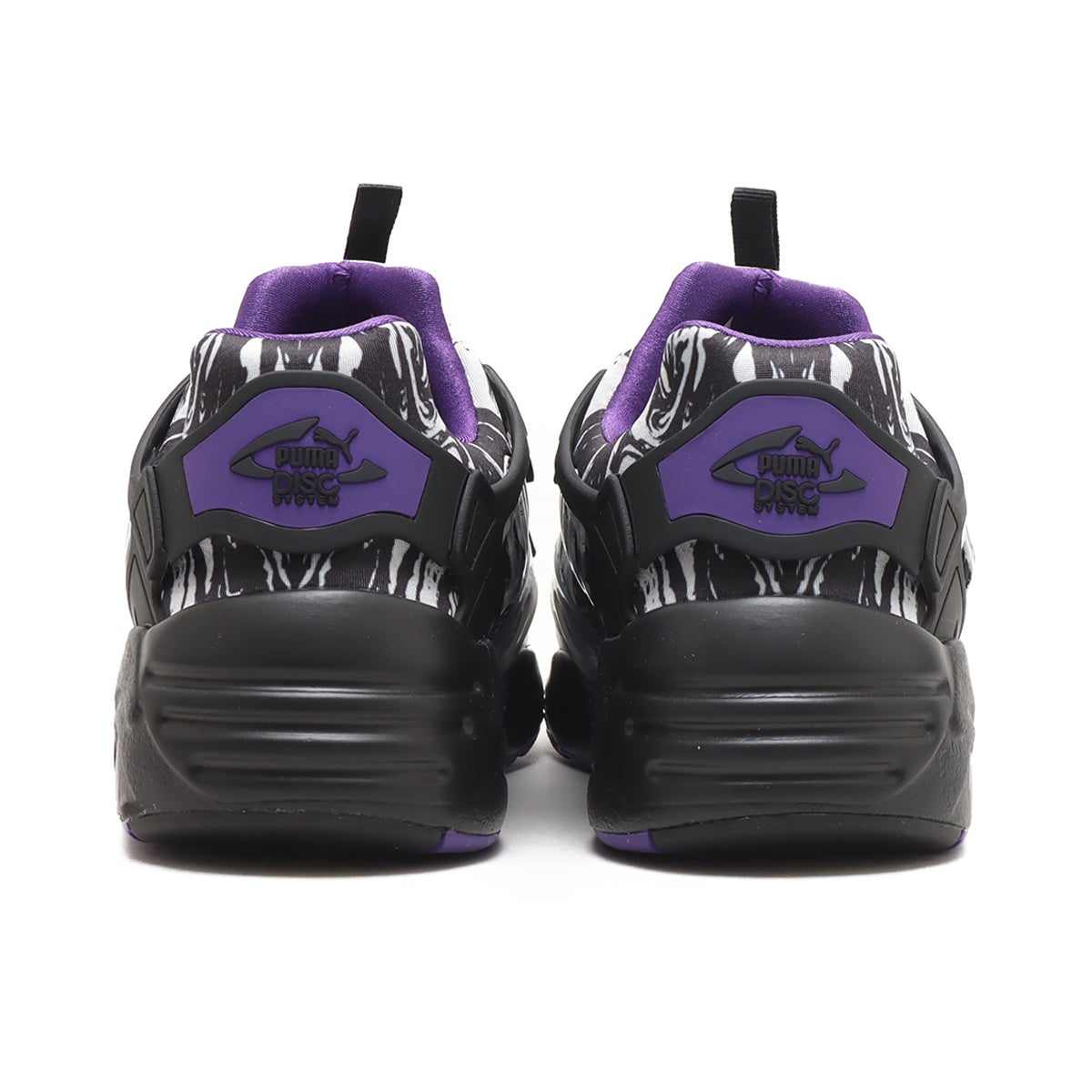 そんな「PUMA」の名機に日本古来より伝わる伝統技法“墨流し”を落とし込んだ「atmos」らしいセンスが光る一足が登場。“墨流し”とは、1000年以上の歴史を持つ古の伝統芸術。水面に波紋状に広がる墨は環境によって異なる表情を作り出す偶発的なアートです。今回その“墨流し”模様を人気書芸家として活躍する赤間紫動氏が手掛けた和モダンなDISC BLAZEがラインナップ。ホワイトベースのアッパーのパーツに“墨流し”をあしらい、アクセントとして高貴なパープルカラーを注入。インソールには、コラボの証として両者のロゴを備えています。