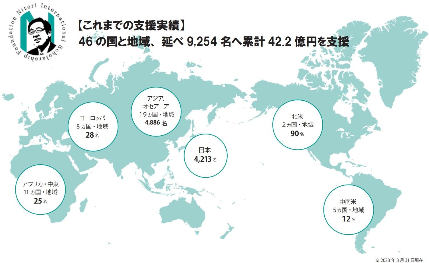 似鳥国際奨学財団は、「ニトリグループが描くロマンの実現に、大きな力を貸してくださったアジア諸国の方々へ恩返しをしたい」という思いから、㈱ニトリホールディングス創業者である似鳥昭雄が私財を寄附し、2005年3月に設立。設立から給付型奨学金(返済義務のない奨学金)の支援を、さまざまな形で広げてきました。2023年3月末までに46の国と地域の9,254名に累計42.2億円の支援をいたしました。