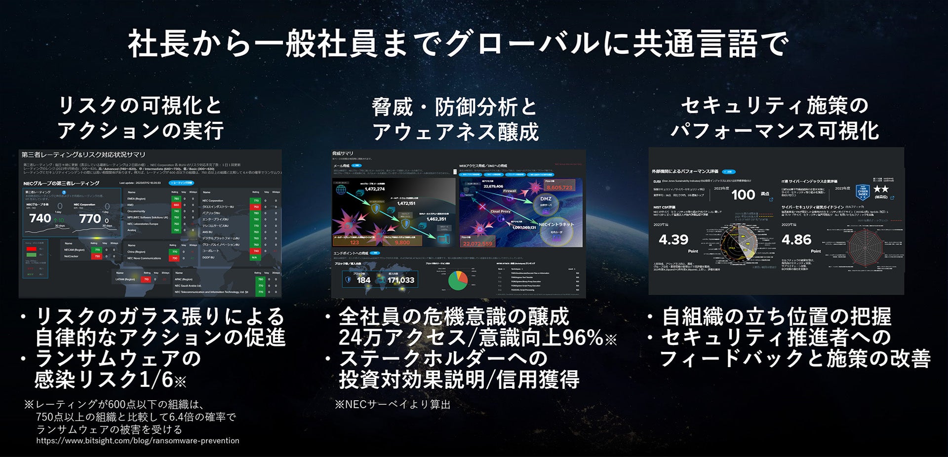 NECは、データファクトに基づいた実行型のセキュリティカルチャー変革を目指し、「サイバーセキュリティダッシュボード」を開発し、経営層を含むグループ全社員に共通言語でリスクと脅威を可視化することで、迅速な意思決定と自律的な対策を実現しました。