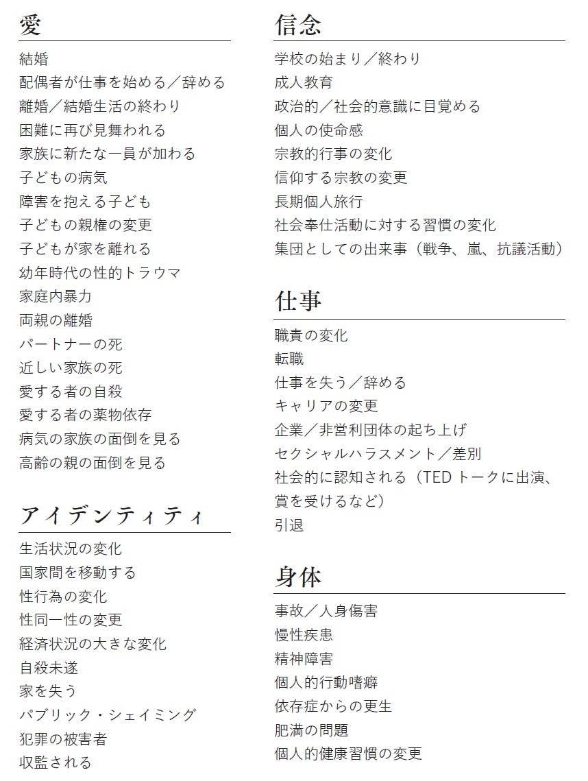 著者は、日々の生活の流れを阻む出来事、具体的にはストレス要因や危機・問題を「破壊的要因」と名付けているが、その出来事自体は善でも悪でもない。「子どもの病気」「両親の離婚」「家を失う」「収監される」といった一般的にはネガティヴにとらえられる出来事さえ、「再出発」のきっかけになる場合がある。「破壊的要因」の数は225人のエピソードの中で52にのぼる。著者はこれを大きく5つに分類し、「愛」「アイデンティティ」「信念」「仕事」「身体」とした。