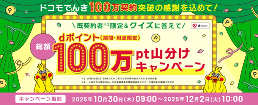 株式会社NTTドコモ(以下、ドコモ)が提供する「ドコモでんき」の契約数が2025年10月20日(月)に100万契約を突破しました。これに加え、光ブロードバンドサービス「ドコモ光」が今年で10周年を迎えたことを記念し、「ドコモでんき100万契約突破記念×ドコモ光10周年記念キャンペーン」と「ドコモでんき100万契約突破記念!クイズに答えて総額100万ポイント山分けキャンペーン」の2つのキャンペーンを2025年10月30日(木)から開催します。