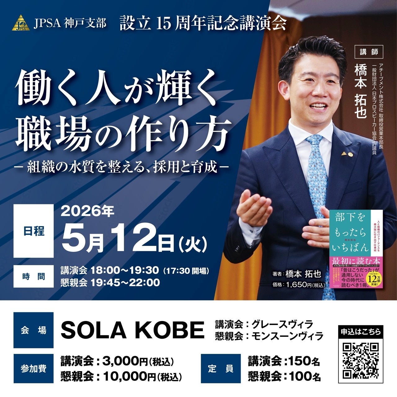 一般財団法人日本プロスピーカー協会(以下JPSAと記載)神戸支部は、2026年5月12日(火)SOLA KOBEにて15周年記念特別講演会を開催します。当日は、神戸市内外から100名を超える経営者やビジネスパーソンが一堂に会し、深刻な人手不足や若手の離職問題を解決する「組織の水質改善」をテーマに、現場ですぐに実践できるリードマネジメントの手法をお伝えします。