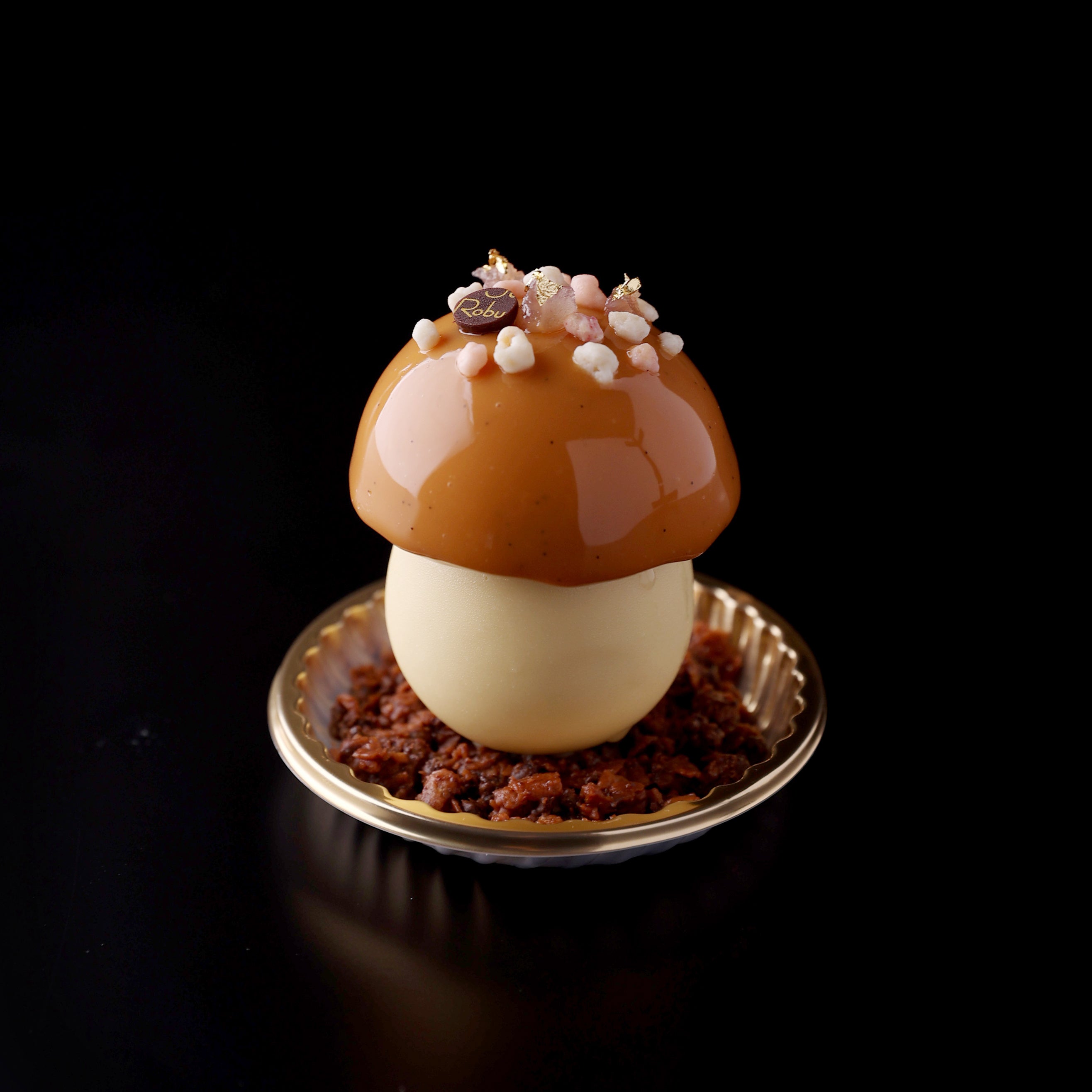 傘部分はカシスのクリームを忍ばせたコクのあるマロンムースを、軸部分はチョコレートクリームを軽やかな味わいのマロンシャンティーで包んだ二層でお楽しみいただける一品です。また、土に見立てたプラリネチョコレートも一緒に召し上がるとさらにサクサクとした食感が加わります。
