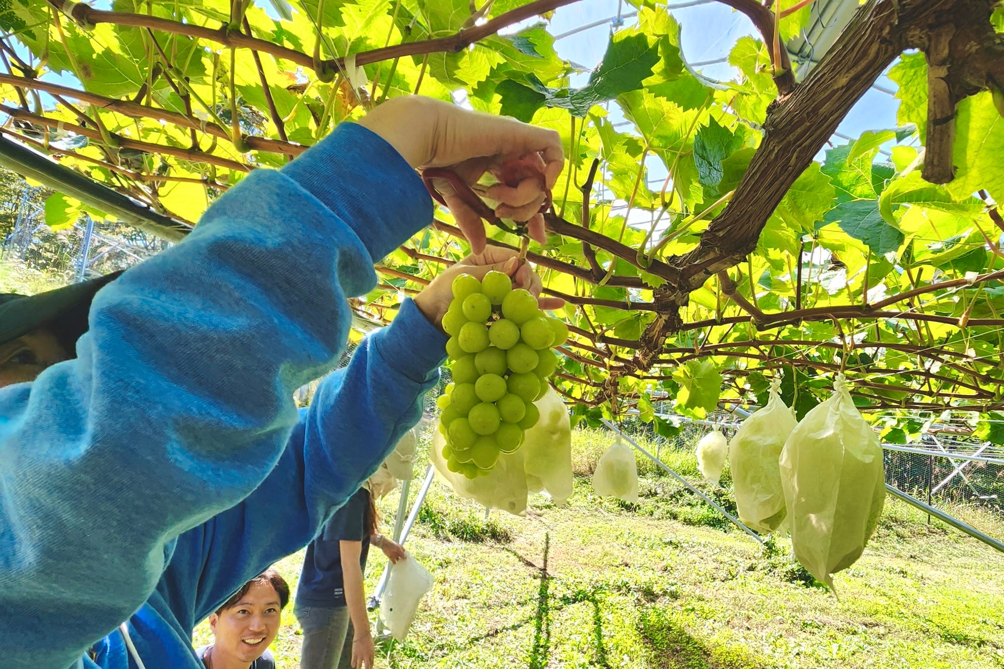 10月12日(土)開催のシャインマスカット収穫では、北杜市の「GREENCOLLAR」圃場で日照時間日本一の太陽光を浴びて大きく成長したシャインマスカットを収穫し、選果場では袋詰めも体験。参加者は、ずっしりと重いシャインマスカットの扱いに苦戦しながらも、山梨の太陽と土が育んだ実りを実感していました。