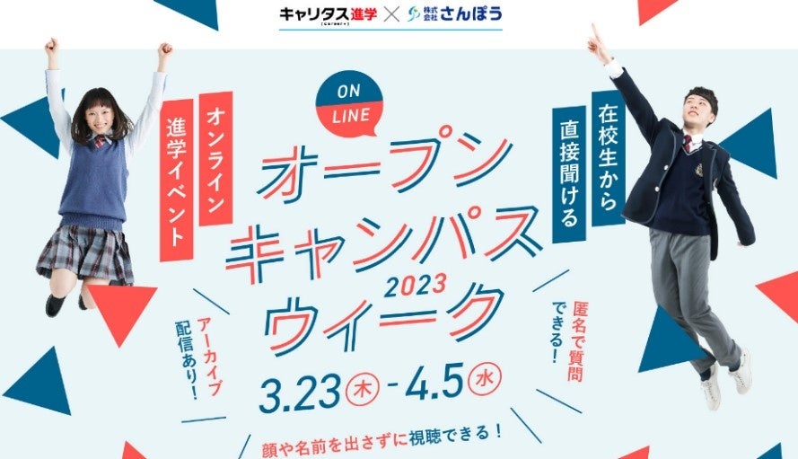 高校生向けに進学情報サイト「キャリタス進学」を運営する株式会社ディスコ(本社:東京都文京区、代表取締役社長:新留正朗)と高校生向け進学イベントを手掛ける株式会社さんぽう(本社:東京都渋谷区、代表取締役社長:渡邉王雄)は共同で、在校生から直接話を聞けるオンライン進学イベント「オンラインオープンキャンパスウィーク2023」を2023年3月23日より2週間にわたって開催します。全国200以上の学校が「学校紹介」「学部・学科紹介」「在校生のリアルな話」「高校生からの質問に回答」などの内容でお届けします。