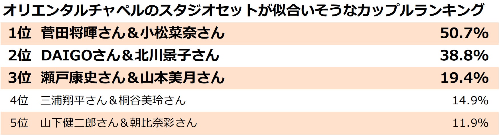 - Oriental Chapel(オリエンタルチャペル)が似合いそうだと思う芸能人カップル1位はDAIGOさん&北川景子さん