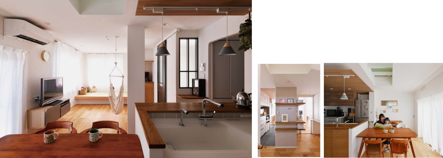 実家を二世帯住宅にリモデル。暗かったLDKを南西に移動し、明るく広々とした空間にしました。また、ダイニング上部の2階の床をグレーチングとすることで、1階に光を取り込みました。LDKに隣接するお母様の部屋は室内窓を通して採光を確保。キッチンを中心に、お母様の部屋、洗面空間へスムーズに移動できる動線となっています。