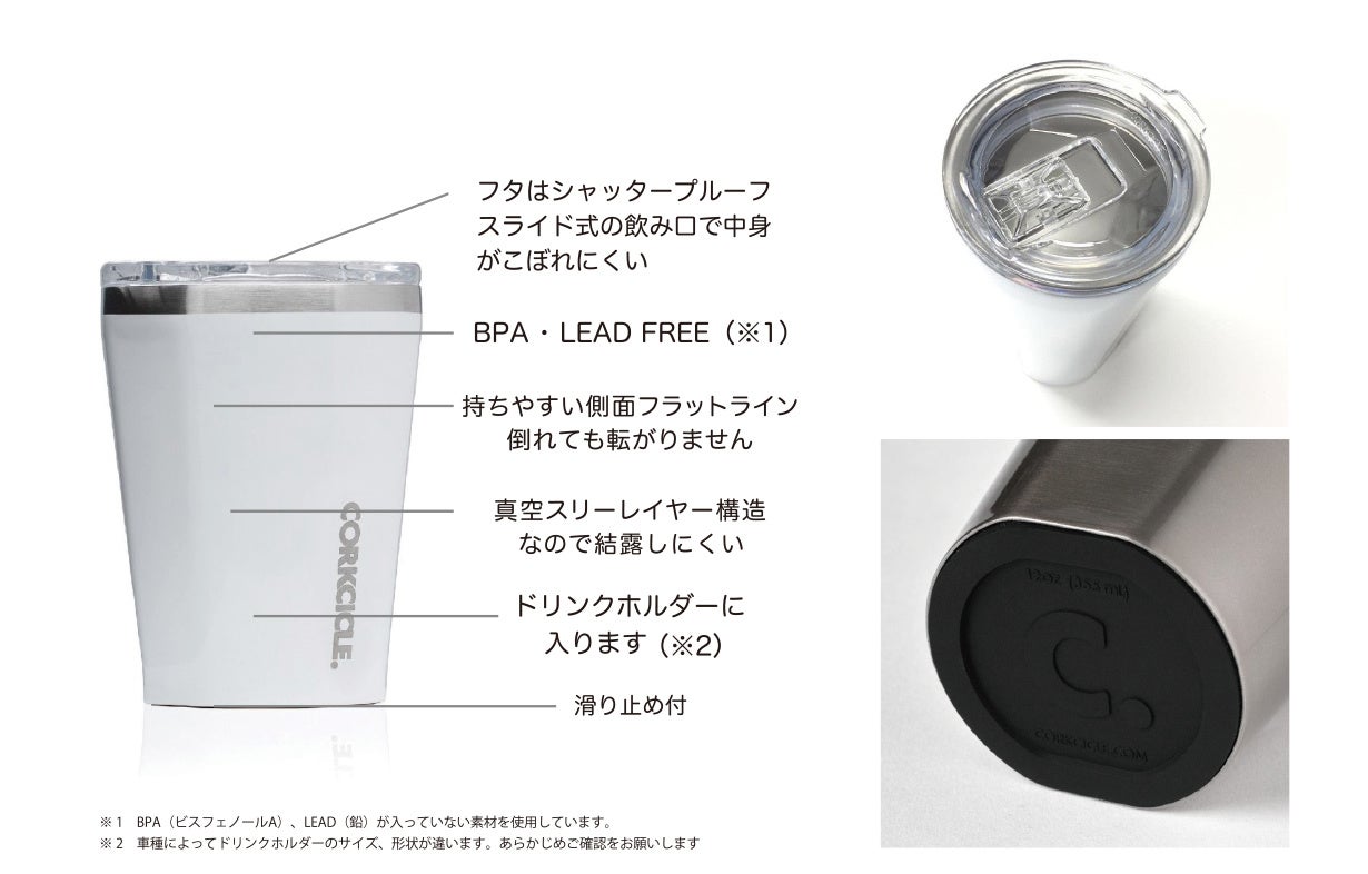独自の3層構造により冷たい飲み物を入れても結露がしにくく素材は、環境に配慮して環境ホルモン物質のBPA(ビスフェノールA)や、鉛を使わない原料で作られています。側面はフラットで持ちやすく、底面にはシリコンの滑り止め付が付いています。