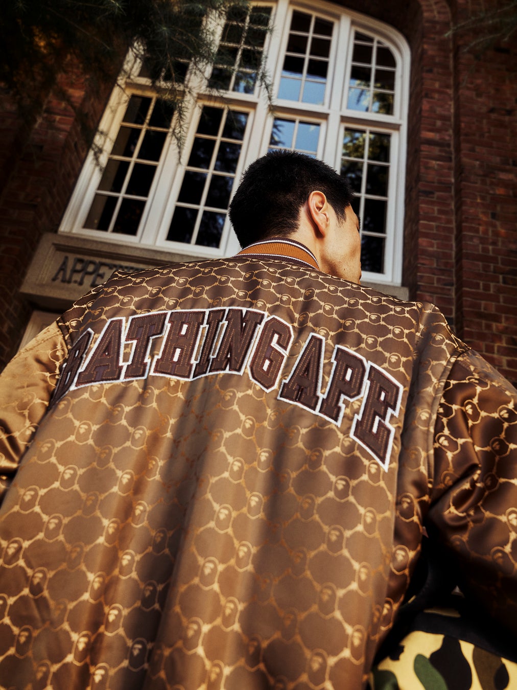 デザインの中心となるのは、アスレチックスタイルからインスパイアされたユニークなプリント。グラフィックやガーメントウォッシュ加工によって、さらに魅力を高めます。その中でも特に注目すべきは、アイコニックなAPE HEADとBAPE STA™を融合させた新しいパターン“COLLEGE MONOGRAM”で、コレクション全体のシグネチャーパターンとなっています。