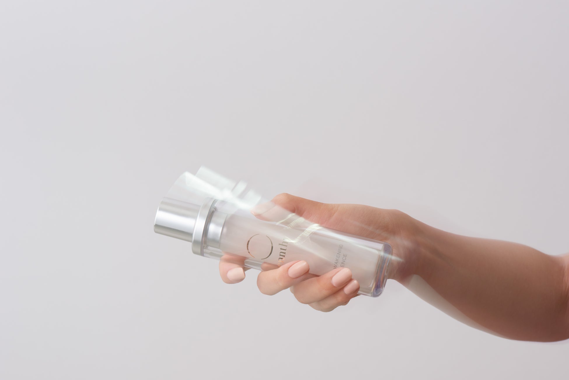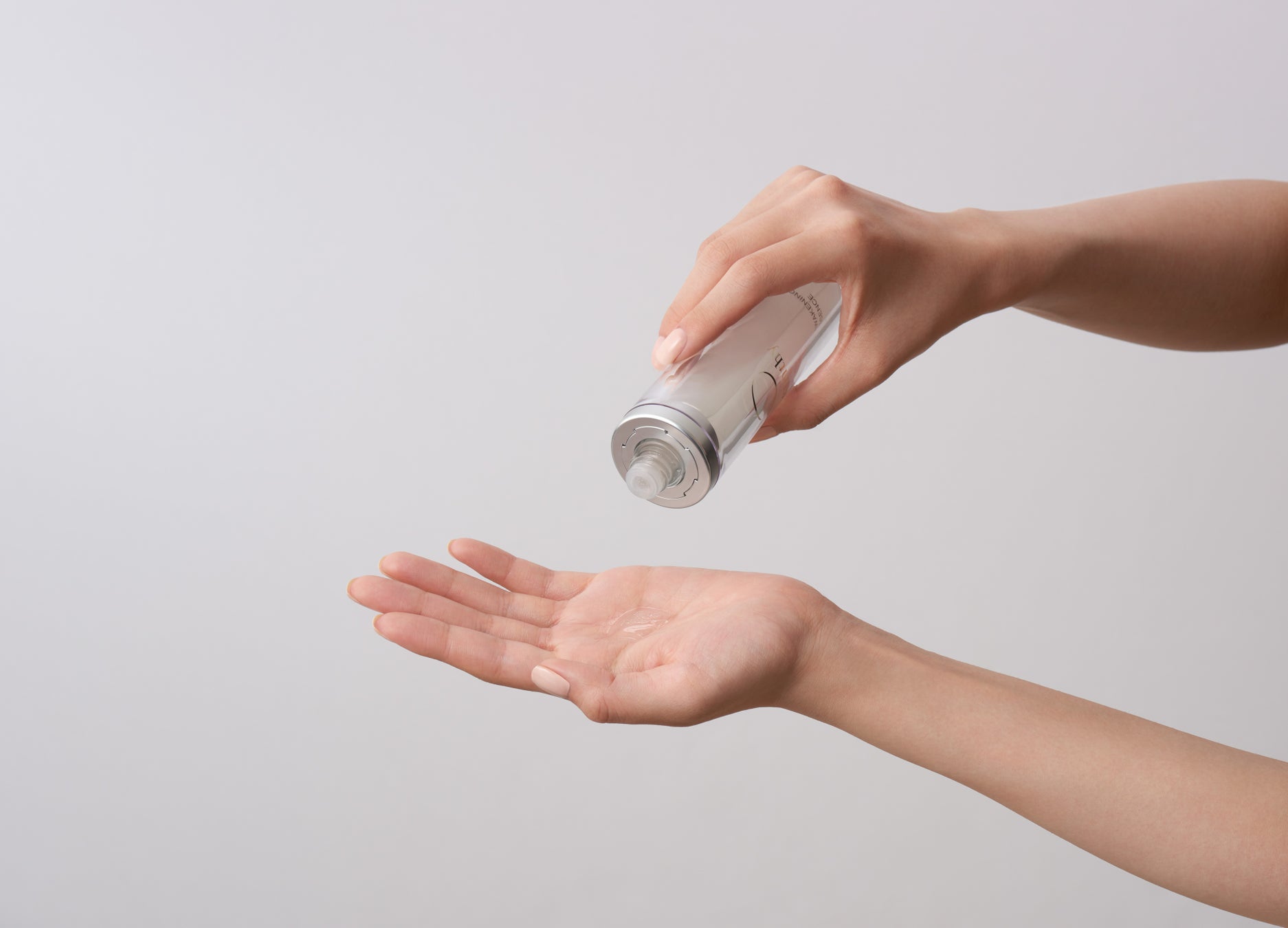 洗顔後、ボトルを5回ほど振って2層をよくブレンドしてから、適量を取って両手に軽く広げ、顔全体になじませます。