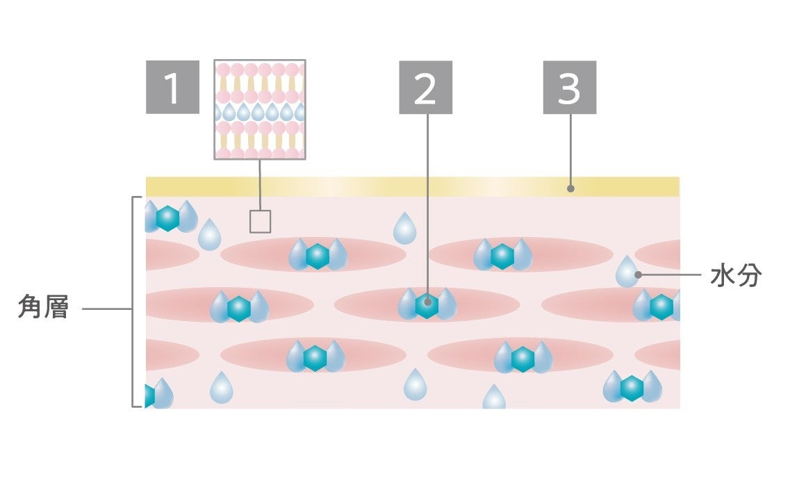 ②天然保湿因子(NMF)…水分をつかまえ、角層をうるおわせる。