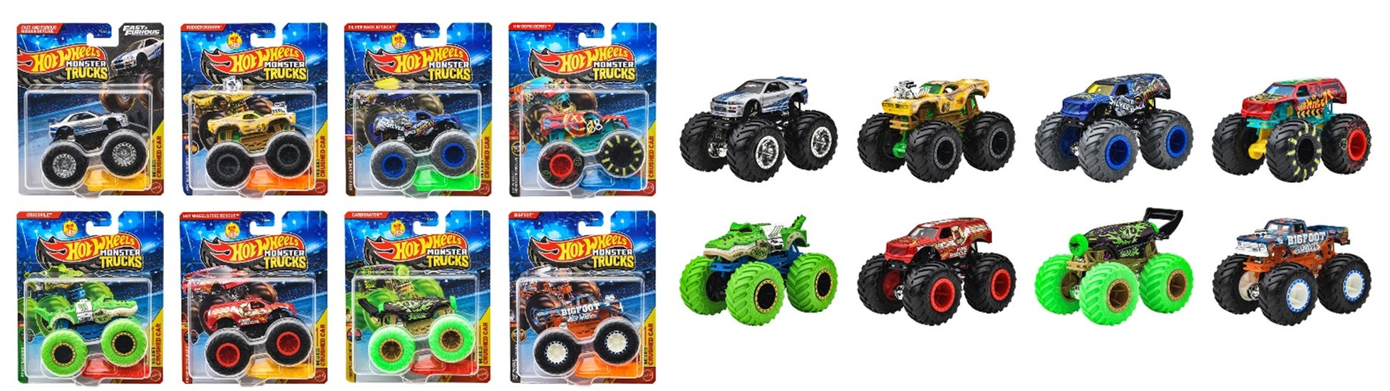 1/64スケールのモンスタートラックに、ワニをモチーフとした新金型モデル「クロコバイル」をはじめ、ドリンクボトルを模したユニークなボディが目を引く「カーボネーター」など、遊び心あふれるオリジナルカーが登場します。さらに、実車ファンからの人気も高い「ワイルド・スピード 日産 スカイライン」もラインアップされ、コレクションとしても楽しめる内容となっています。モンスタートラックでクラッシュできる車も1台付属し、すぐに迫力あるアクションを楽しめます。