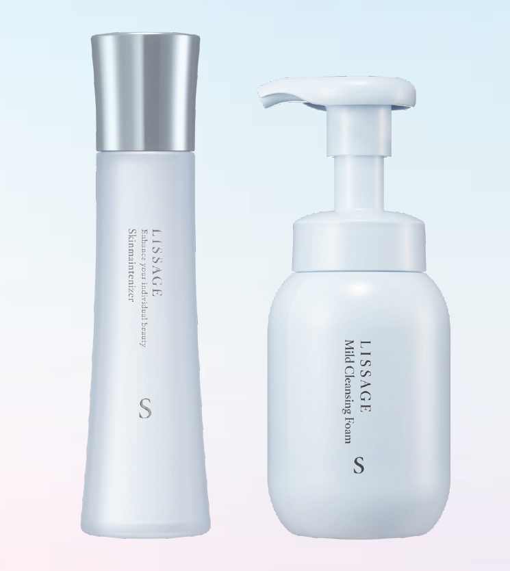 そんな時でもエイジングケア**を諦めたくないと考える方のために。化粧水と乳液の充実感を1本に凝縮した化粧液「スキンメインテナイザー (S)」と、クレンジングと洗顔が2in1になった泡洗顔料「マイルドクレンジングフォーム (S)」は、やさしい感触で肌をいたわりながらハリのある美しさへと導きます。