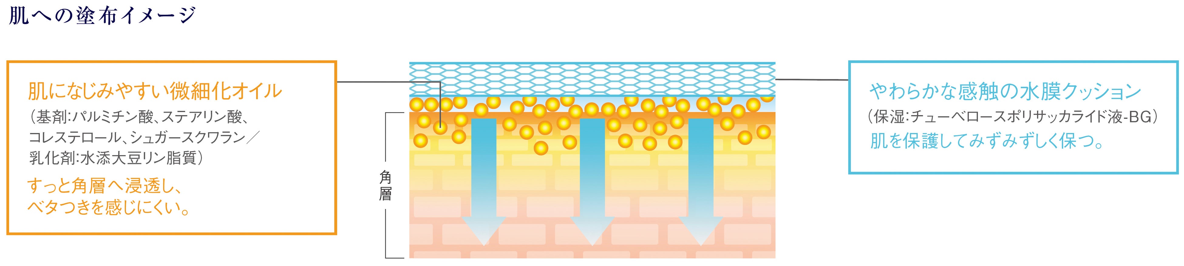 オイルを微細化して配合することで角層へ浸透し、べたつき感なく肌になじみます。また、水膜クッションが塗付時の摩擦を軽減し、肌あたりやわらかく、肌表面を保護してみずみずしく保ちます。