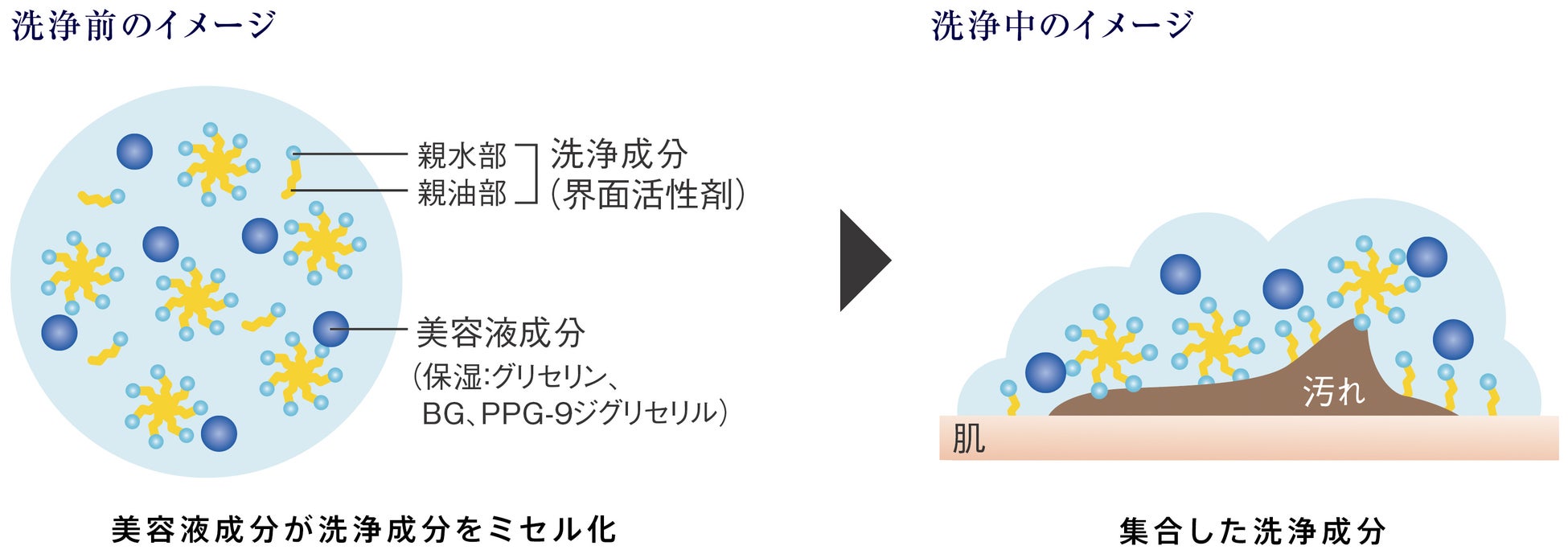 美容液成分と洗浄成分がメイク汚れなどの油性成分になじみやすい集合体を形成し(=ミセル化)、うるおいは肌に残しながら汚れに集中密着し、巻き込んで落とします。