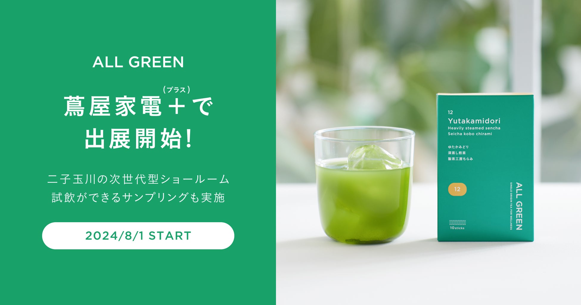 株式会社ゼロワンブースター(本社:東京都千代田区、代表取締役:合田ジョージ、 以下01Booster)が販売する、シングルオリジン・ティーの栄養を丸ごとおいしく飲める緑茶「ALL GREEN」は、二子玉川 蔦屋家電 1階の次世代型ショールーム「蔦屋家電+(プラス)」に2024年8月1日(水)~8月7日(水)の期間限定で出展します。期間中、来場者にALL GREENの試飲ができるサンプリングも実施しますので、この機会にぜひ足をお運びください。