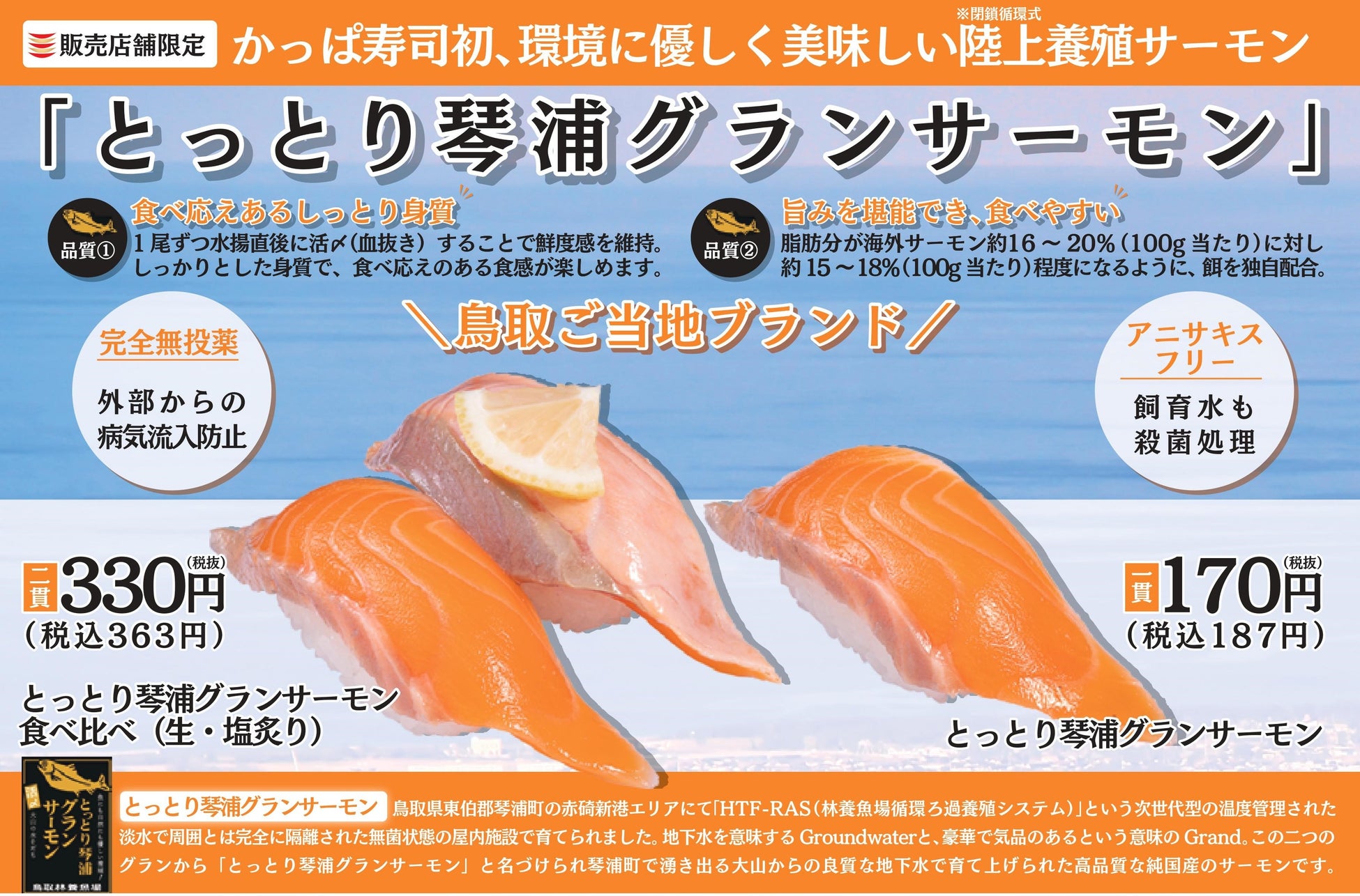 かっぱ寿司初、環境に優しく美味しい陸上養殖※サーモンを提供 鳥取ご当地ブランド「とっとり琴浦グランサーモン」2商品を販売