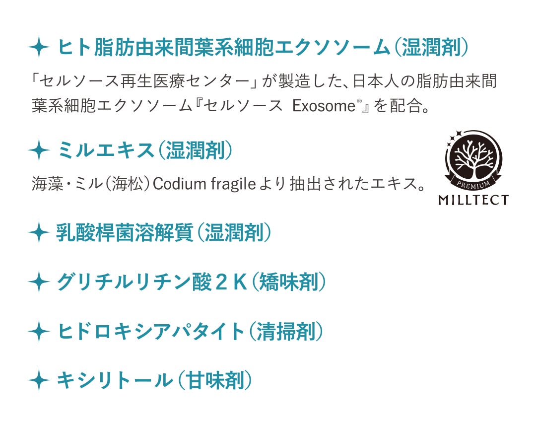 水、ソルビトール、グリセリン(湿潤剤)、含水シリカ(清掃剤)、セルロースガム(増粘剤)、クエン酸Na(pH調整剤)、キシリトール(甘味剤)、ラウロイルグルタミン酸Na(発泡剤)、PEG-8(溶剤)、ヒト脂肪由来間葉系細胞エクソソーム、ミルエキス、乳酸桿菌溶解質(湿潤剤)、セチルピリジニウムクロリド、o-シメン-5-オール(防腐剤)、グリチルリチン酸2K(矯味剤)、アロエベラ葉エキス、オトギリソウ花/葉/茎エキス、カミツレ花エキス、シャクヤク根エキス、セイヨウハッカ葉エキス、トウキンセンカ花エキス、ドクダミエキス、ハマメリス葉エキス、ホップエキス、ローズマリー葉エキス(湿潤剤)、ヒドロキシアパタイト、シリカ(清掃剤)、三リン酸5Na、硝酸K、炭酸水素Na(pH調整剤)、キサンタンガム(増粘剤)、コカミドプロピルベタイン(発泡剤)、塩化Na(矯味剤)、サッカリンNa(甘味剤)、デキストリン(分散剤)、BG、ペンチレングリコール(溶剤)、酢酸トコフェロール(製品の抗酸化剤)、フェノキシエタノール(防腐剤)、サリチル酸メチル、グレープフルーツ果皮油、ハッカ油、メントール(着香剤)、酸化チタン(着色剤)