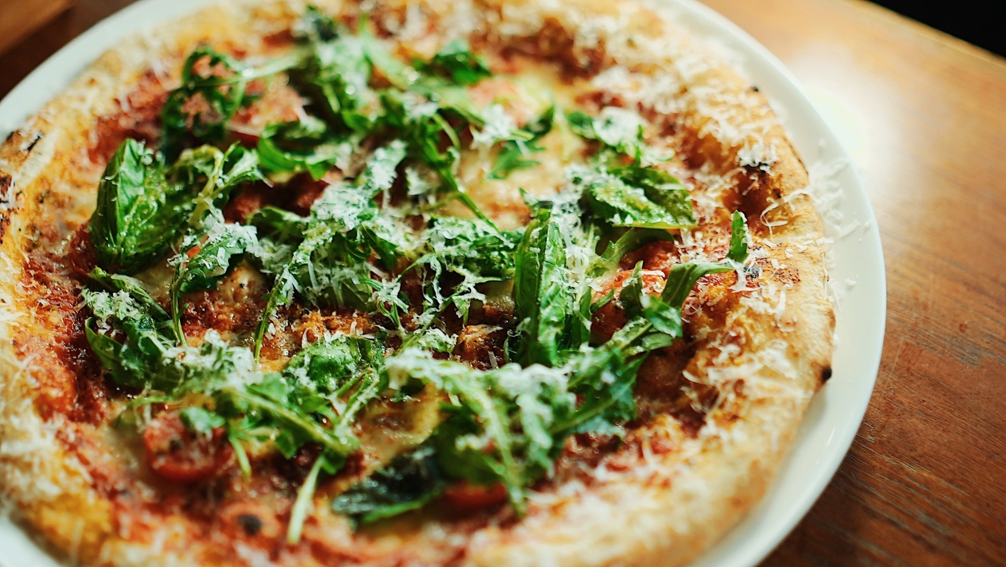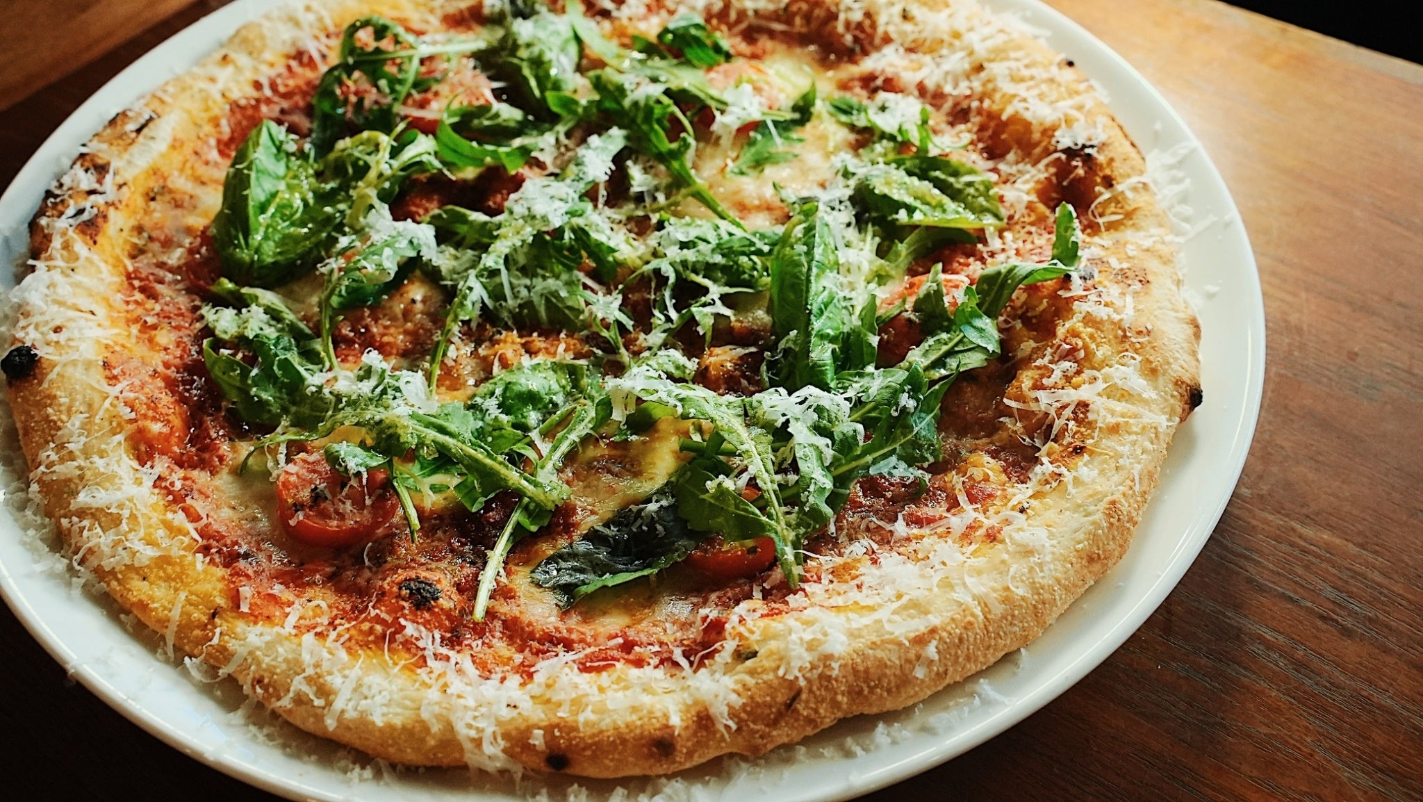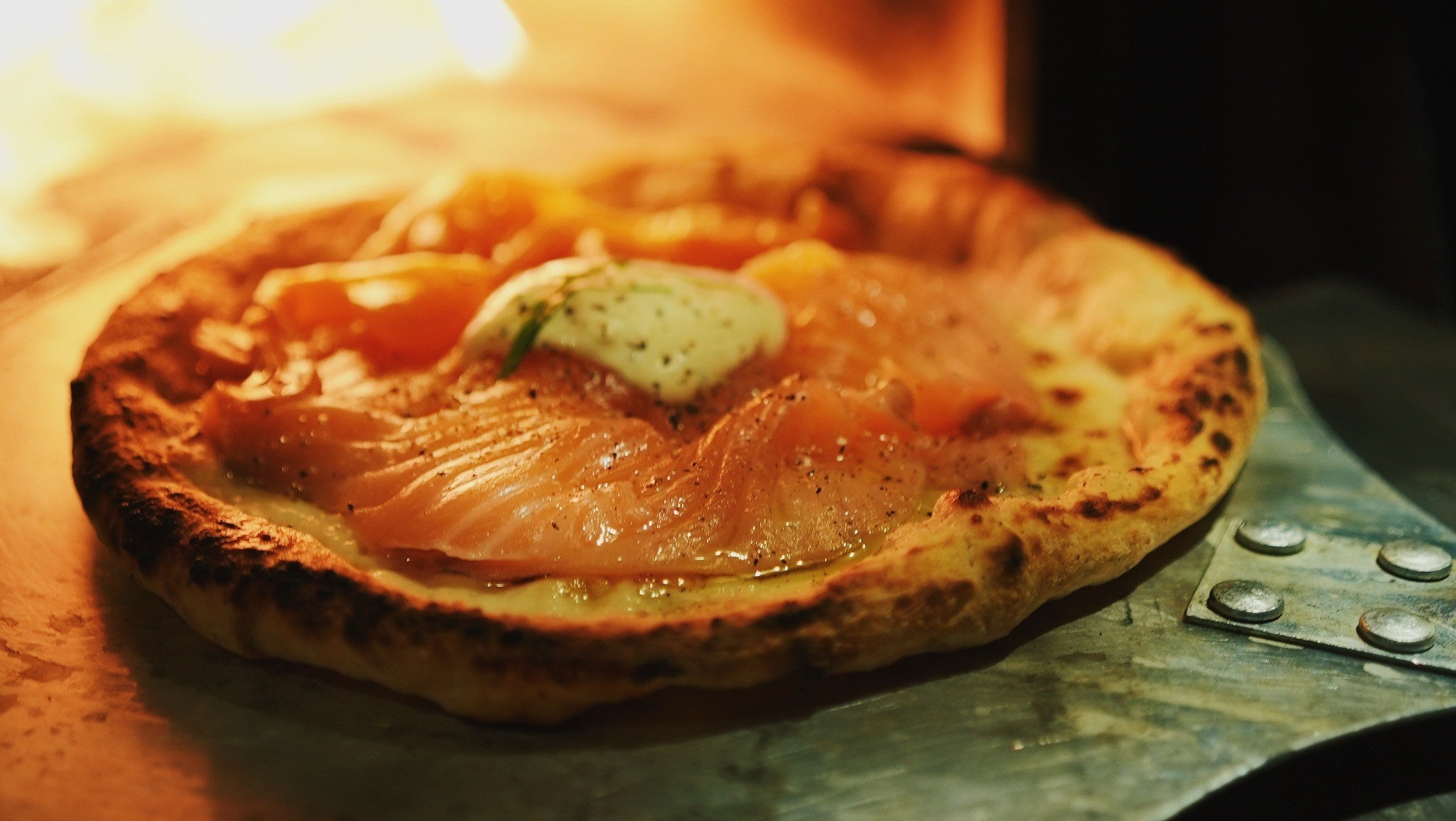 職人が手ごねで仕上げる自家製生地のピザ。高温で一気に焼き上げる直径30cmの大判サイズ。その日使う分だけを毎朝店内でピザ職人が生地から仕上げるからとにかく美味しい。