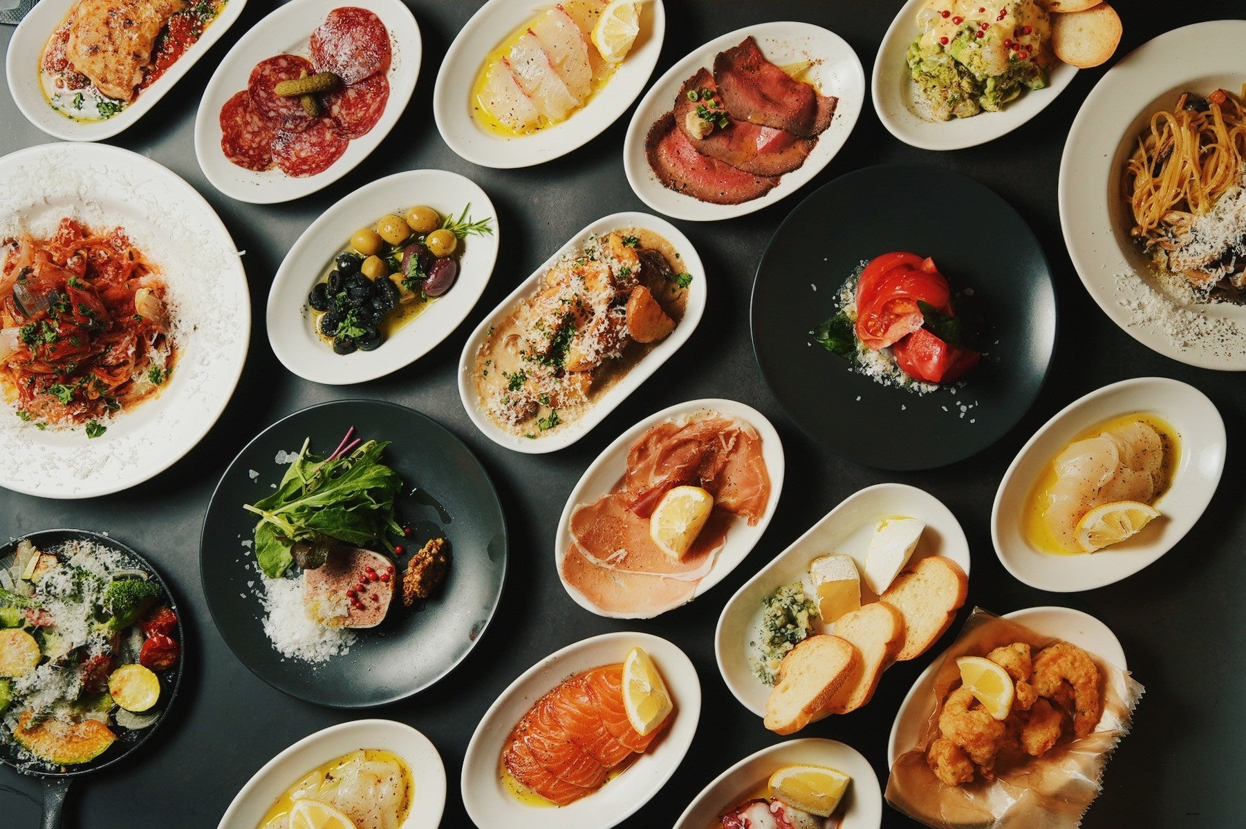 一皿390円から楽しめる約20種のイタリアンタパスや450℃の石窯で焼きあげる自家製生地の本格ピザ。