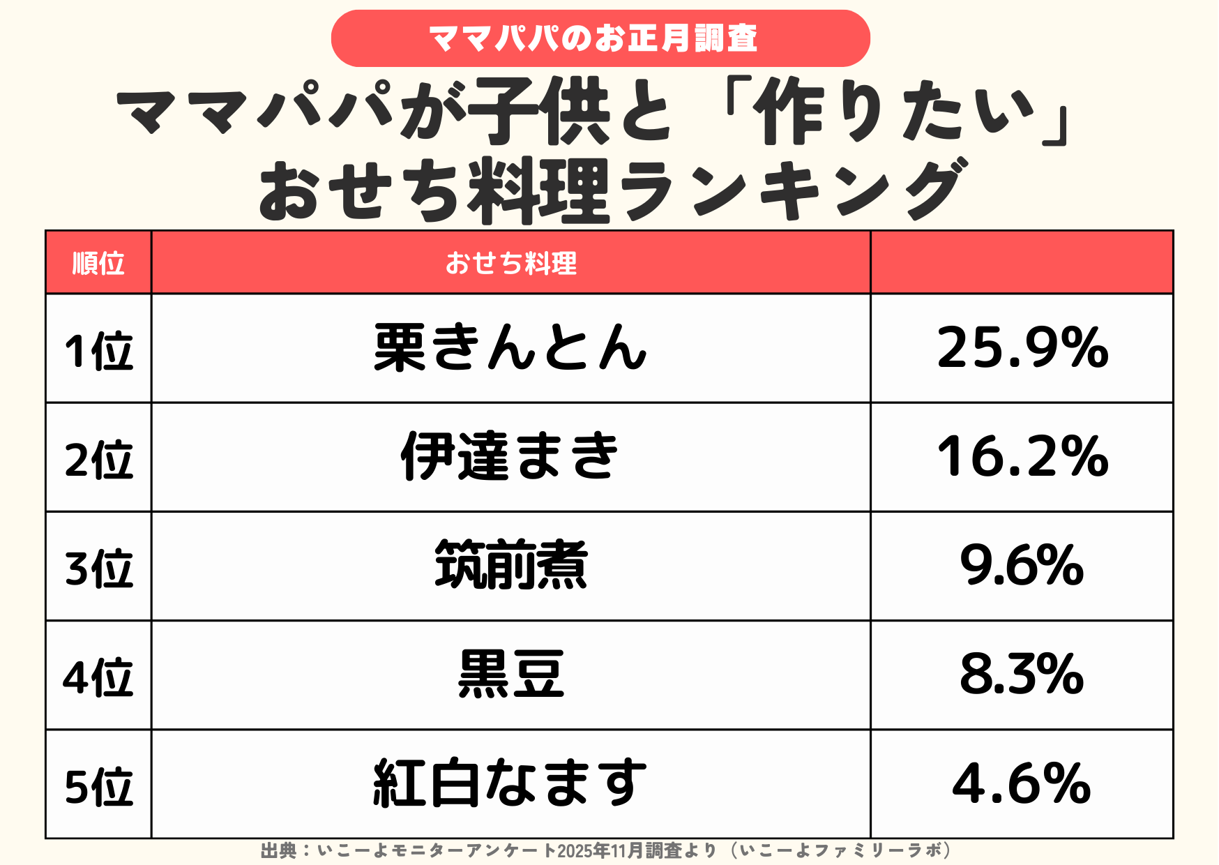ママパパが子供と作りたいおせち料理についても聞いてみると好きなおせち料理でも上位にあがった「栗きんとん」「伊達まき」「黒豆」などの甘めのものがあがっています。