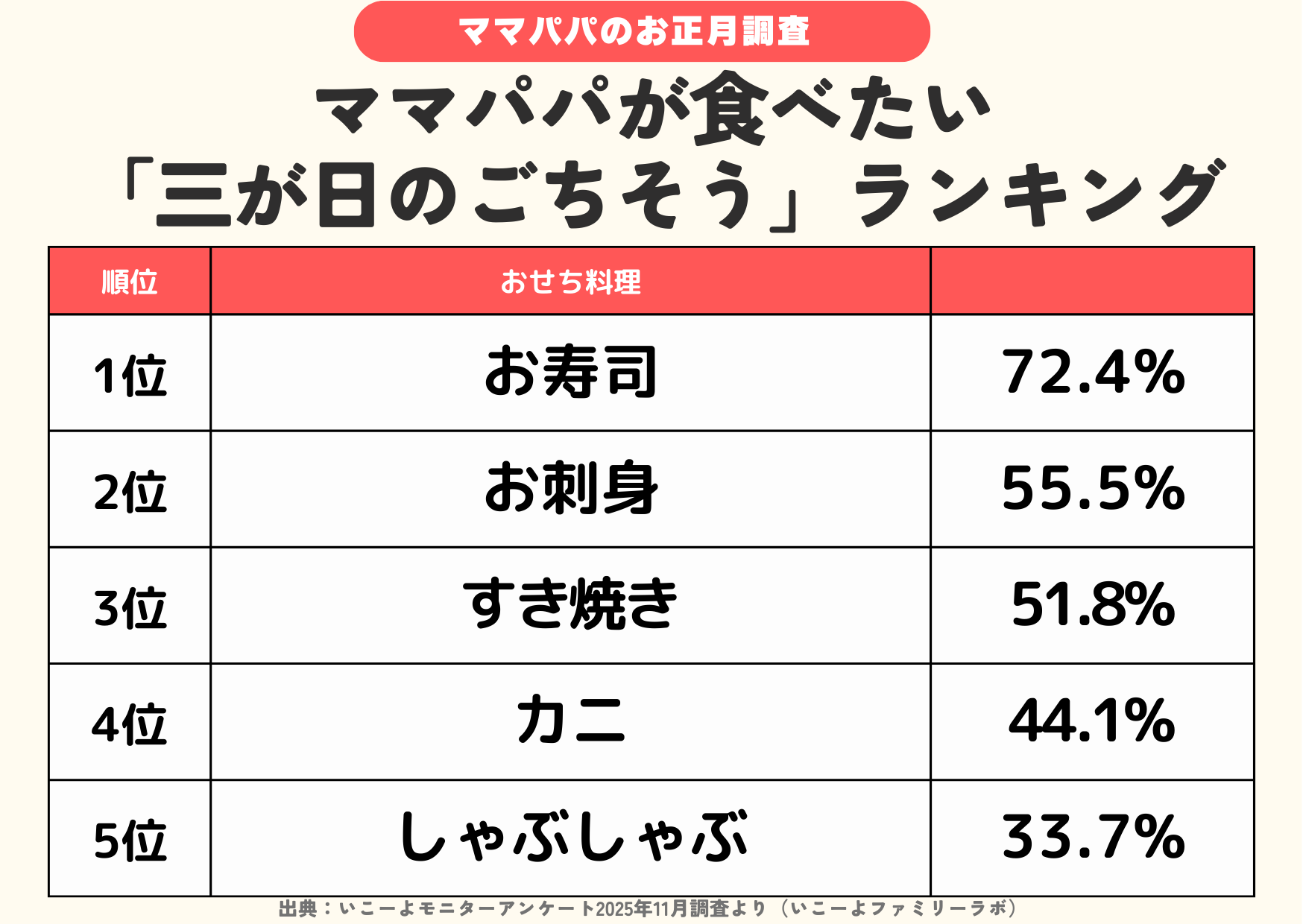 発表!ママパパ&子供が好きな「おせちランキング」正月に食べたい「ごちそうランキング」も!7つのおせちランキングを発表!/いこーよファミリーラボ調査2025【冬休み・冬レジャー調査リリース第1弾】