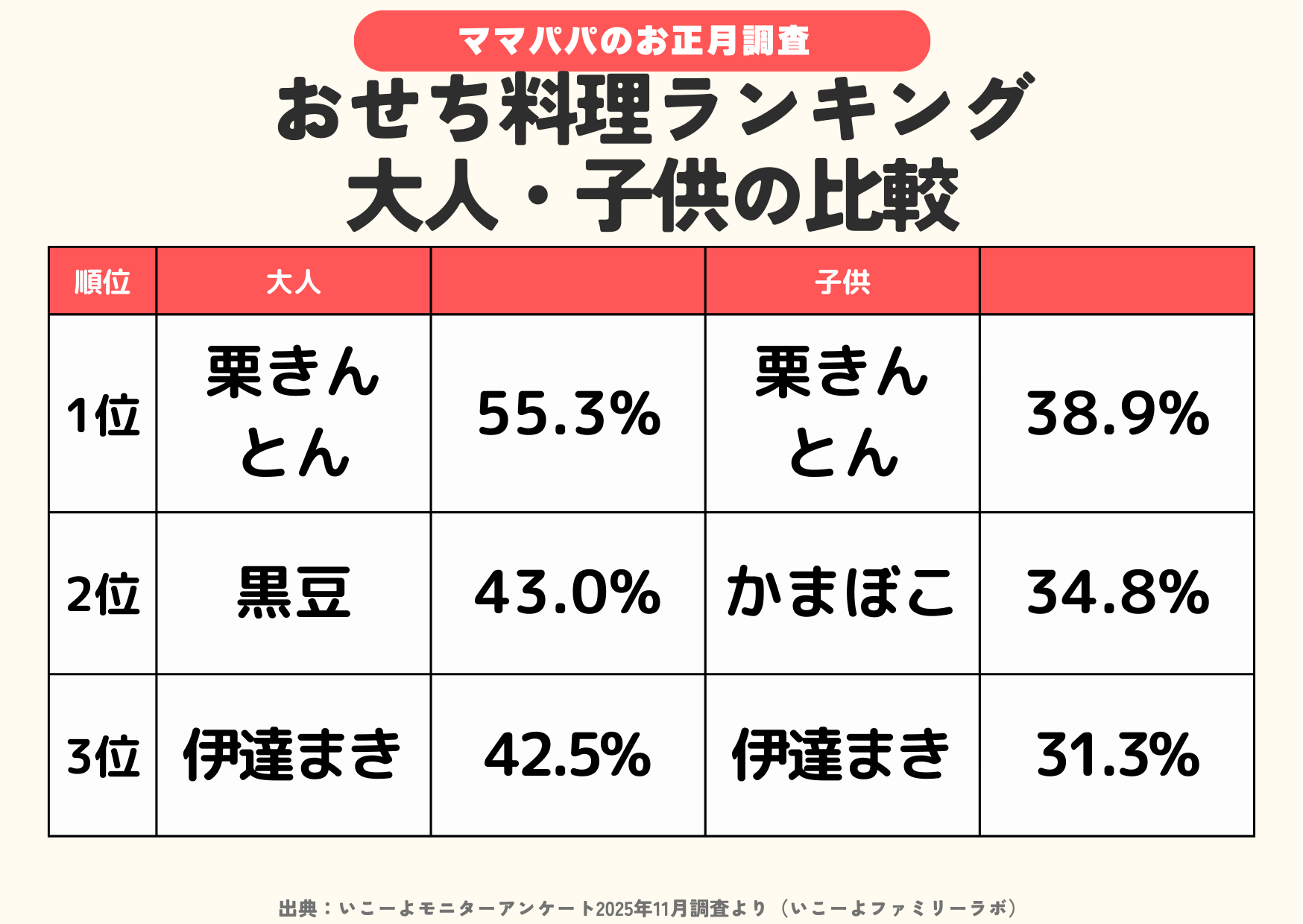 親子共通で「栗きんとん」がトップに! ほかにベスト5に「黒豆」「伊達巻」がはいっており、親子ともに甘めの味付けのメニューに人気が集まる傾向があります。