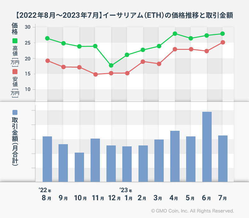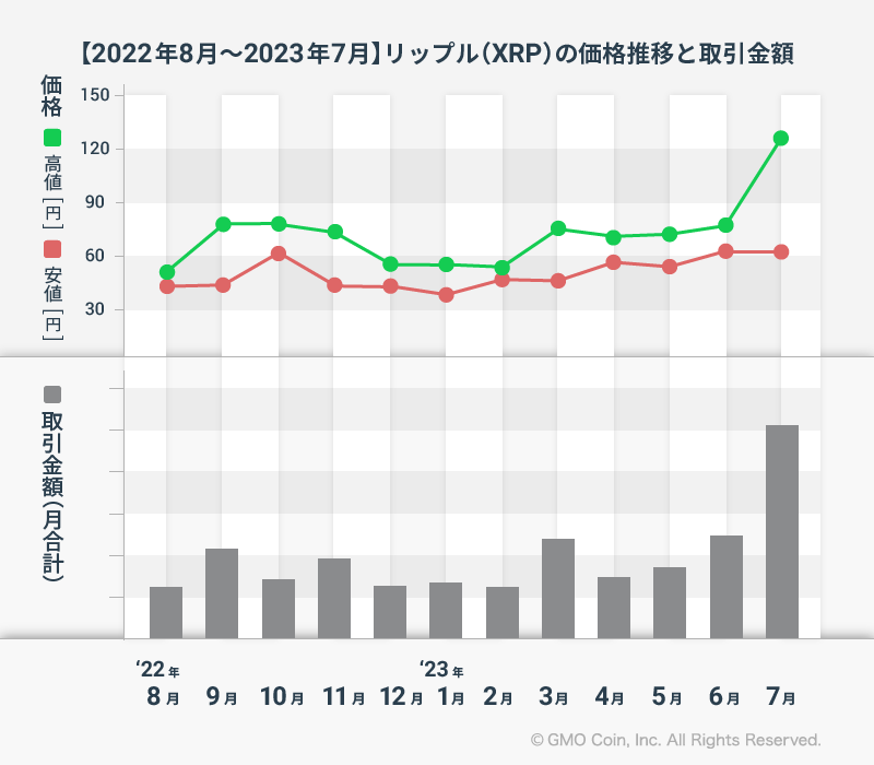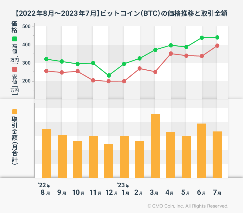 GMOコイン:【2023年8月最新版!】ビットコイン、イーサリアム、リップルの1年間の価格推移と取引金額