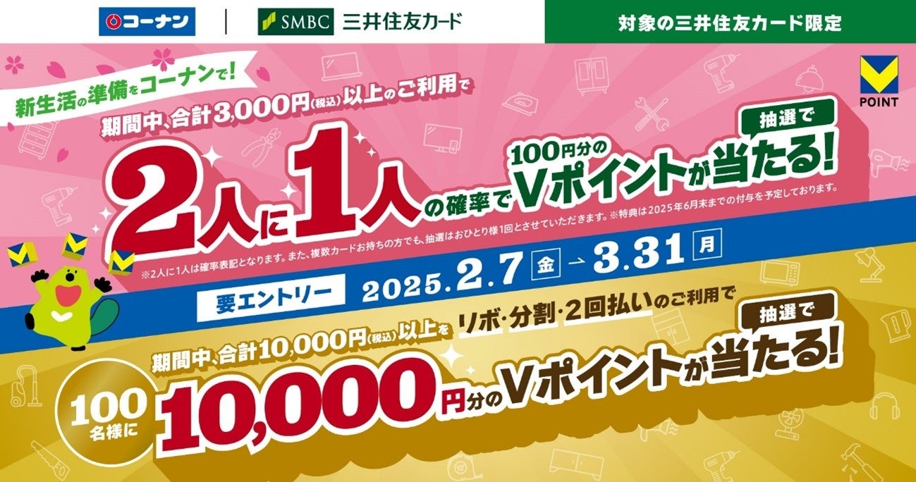 三井住友カード株式会社(本社:東京都江東区、代表取締役社長:大西 幸彦 以下:三井住友カード)は、2025年2月7日(金)より、コーナン商事株式会社(本社:大阪府大阪市淀川区西宮原、代表取締役社長 疋田直太郎 以下:コーナン)、が運営する全国のコーナン(コーナン・コーナンPRO・Home Stock・gardens ・CAMP DEPOT)・コーナンeショップにて、対象の三井住友カードで期間中合計3,000円(税込)以上ご利用で2人に1人の確率で100円分のVポイントが当たるキャンペーンを開催いたします。さらに、期間中合計10,000円(税込)以上をリボ・分割・2回払いのご利用で100名様に10,000円分のVポイントが当たる特典もご用意しております。是非この機会に三井住友カードを使ってコーナンでのお買い物をお楽しみください。