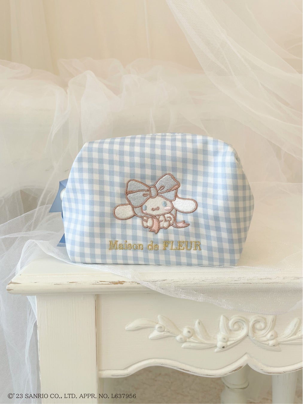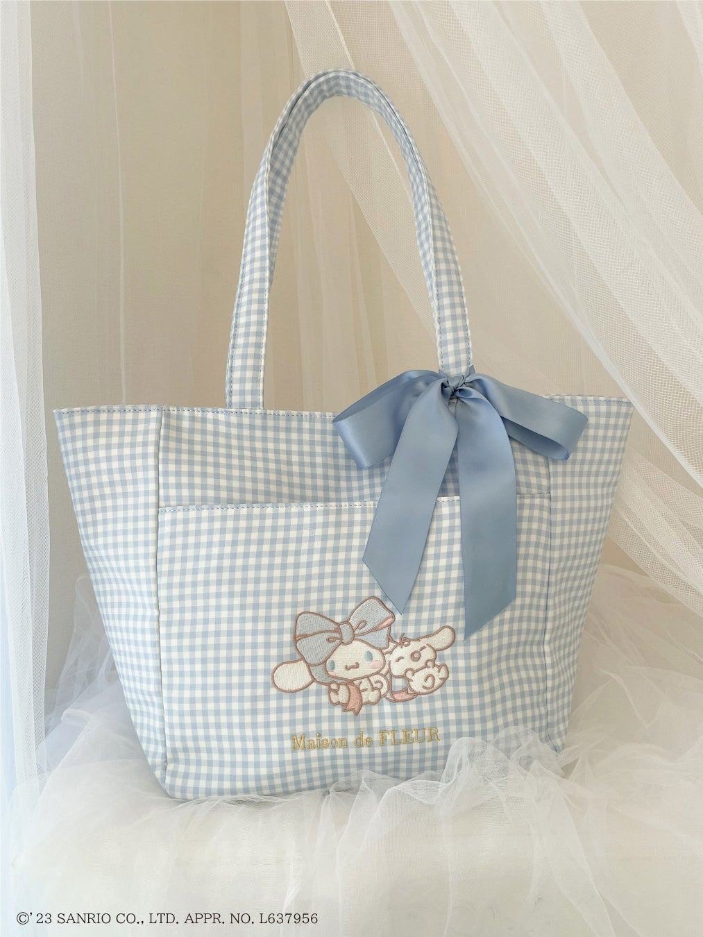 本コレクションでは、シナモロールとMaison de FLEURのアイコンでもあるリボンを組み合わせました。くすみブルーのギンガムチェック生地を使用したトートバッグとポーチは、リボンで頭を包んだシナモロールを刺繍。トートバッグには、シナモロールのことが大好きなみるくも添えました。