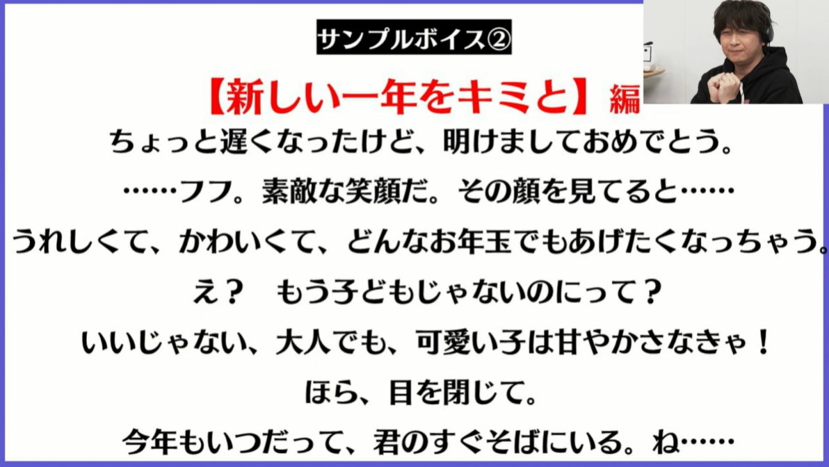 アンケートの結果、「新しい一年をキミと編」が選ばれ平川が読み上げるシチュエーションボイスを聴いた視聴者は「きゃあああああああ」「うわぁぁぁぁぁぁぁぁ」「たまらーん」などの悶絶コメントと共に、ワイプに映る小野の顔に「小野D!!顔!」「目を閉じて聴きたいのにワイプwwww」「ワイプおもろいwwwwww」「ワイプ芸」など小野の表情に対するコメントも続出していました。 「最&高」「ダミヘの使い方うまい!」と絶賛する小野に、平川は「やっぱり呼ぶのは後輩だね(笑)」とスタジオを笑いに包み込みました。