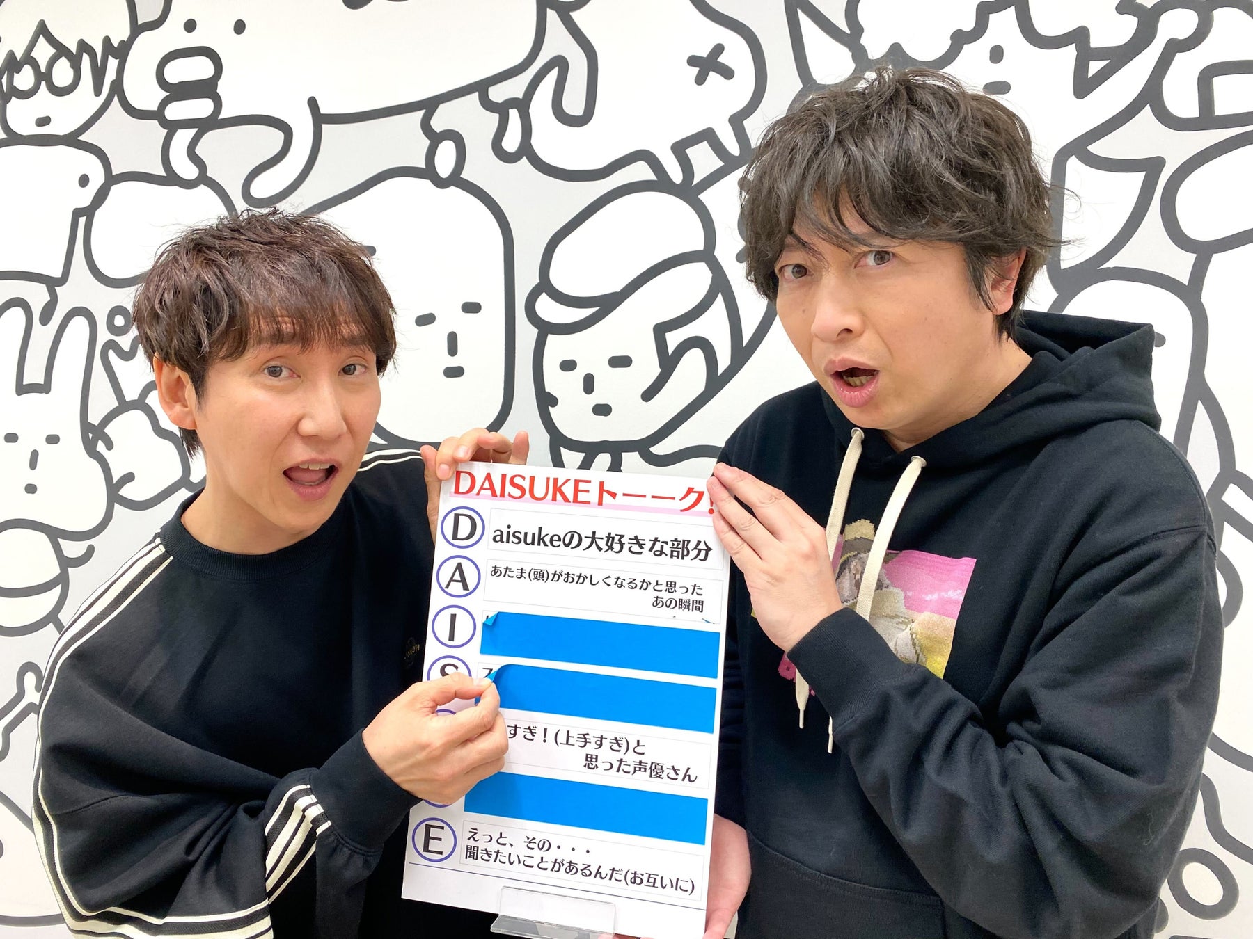 後半の「animelo+」会員限定コーナーの企画は、【D】【A】【I】【S】【U】【K】【E】の各アルファベットにちなんだトークテーマについて話す『DAISUKEトーク』へ。「【D】aisukeの大好きな部分」の話題では、お互いの性格を深く分析した真面目な話になり「こんな(真面目な)流れでいくんですか?」(小野)と盛り上がりを心配したところに、次のテーマは「【A】頭がおかしくなるかと思ったあの瞬間」に。「よかった!バランス取れるこれで!」(小野)と質問内容の振り幅に大爆笑する2人。ここでは平川がやる某テレビショッピング会社社長のモノマネを振られ、ノリよくモノマネを披露する姿に「平川さんの社長のモノマネ好きw」「サービスしすぎwww」「やってくれるwwww」と視聴者も大喜びの反応が寄せられました。