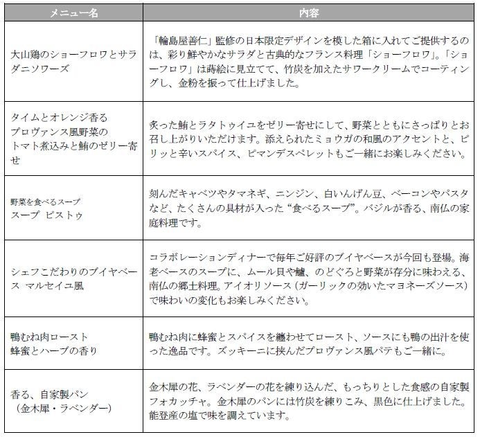 ◇ディナーのテーマは「能登プロヴァンス折衷」。能登とプロヴァンスの趣を感じるひとときを