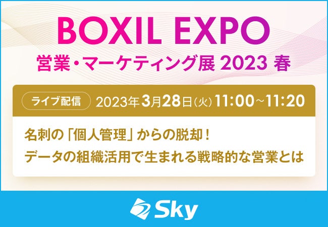 Sky株式会社は2023年3月28日(火)~3月30日(木)まで開催されるオンライン展示会「BOXIL EXPO 営業・マーケティング展 2023 春」(主催:スマートキャンプ株式会社)にて、『名刺の「個人管理」からの脱却!データの組織活用で生まれる戦略的な営業とは』と題したセミナーを実施いたします。