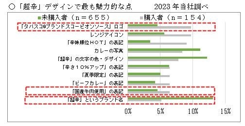 未購入者はタバスコ®ブランドスコーピオンソースのロゴや「国産牛肉使用」「超辛」といった表記に魅力を感じていることから、こうした差別化要素をさらに訴求するパッケージへのブラッシュアップが求められています。