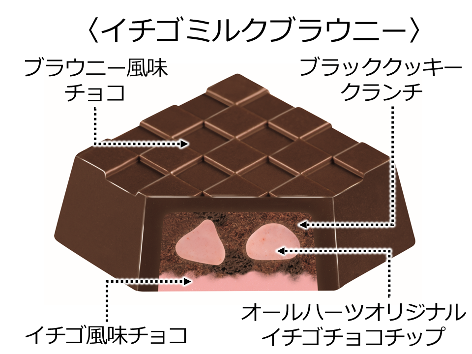 オールハーツオリジナルのイチゴチョコチップとブラッククランチクッキーをブラウニー風味チョコで包みました。ボトムにイチゴ風味のチョコを合わせ、ミルキーなイチゴミルクブラウニーを再現。