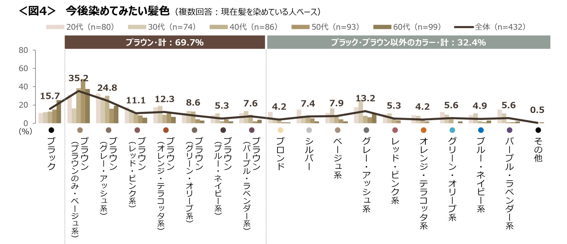 20~30代は、今後染めたい色として他の年代よりも高い項目が多く、様々な色に挑戦したい様子が見られる。<図3・図4>