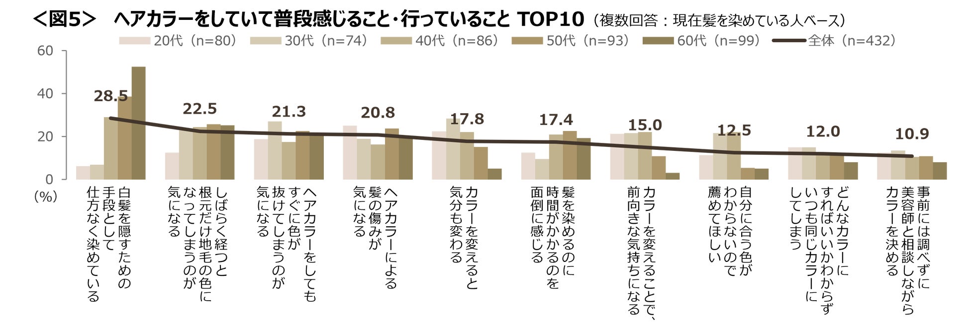 50~60代は「白髪を隠すための手段として仕方なく染めている」が特に高い。20~40代は「カラーを変えると気分も変わる」「カラーを変えることで、前向きな気持ちになる」など、ポジティブなイメージをもっていることがうかがえる。<図5>